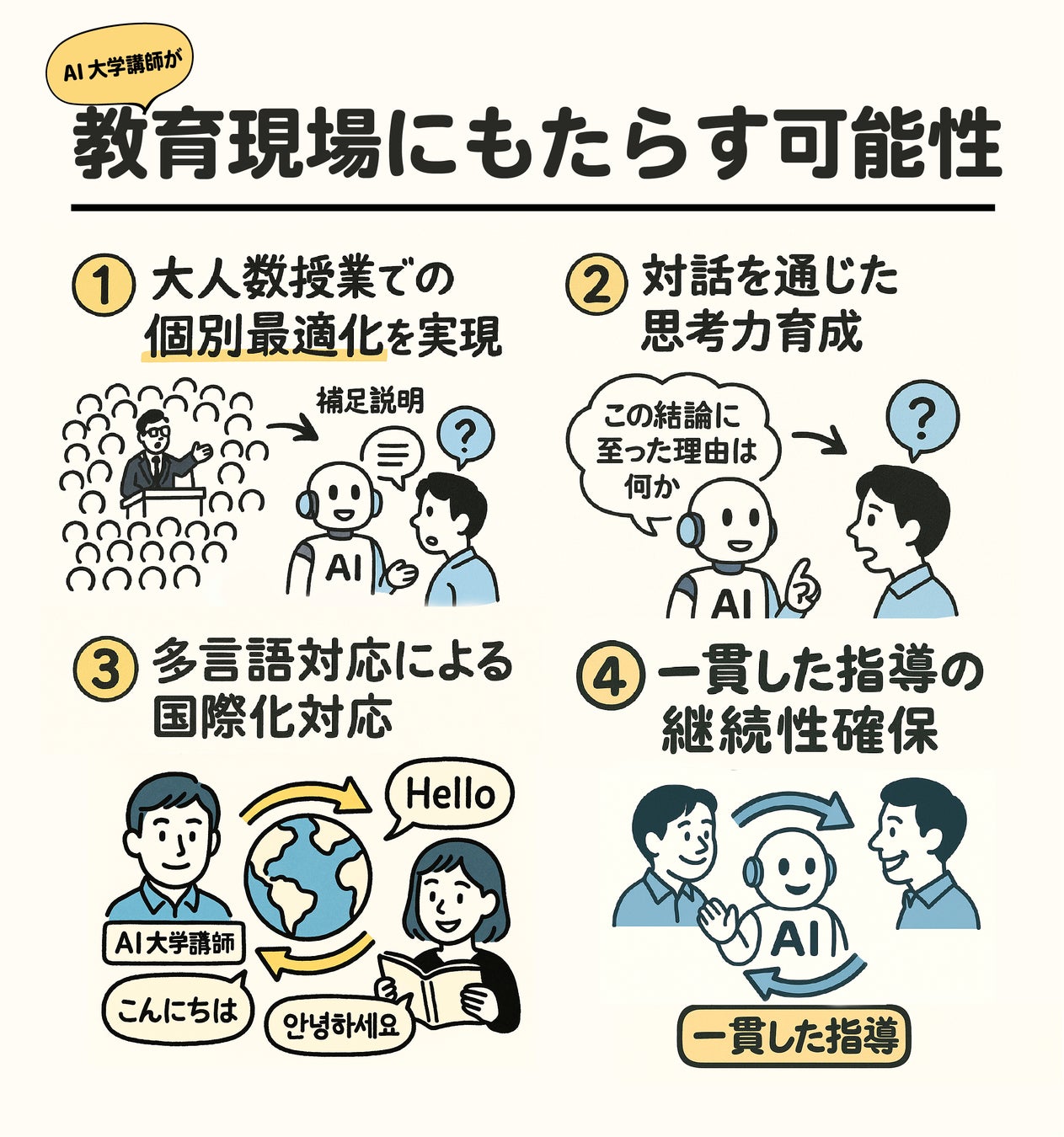 「AI大学講師」の導入により、高等教育の現場に新たな教育価値が生まれています。本サービスを導入することで、次のような効果が期待されます。