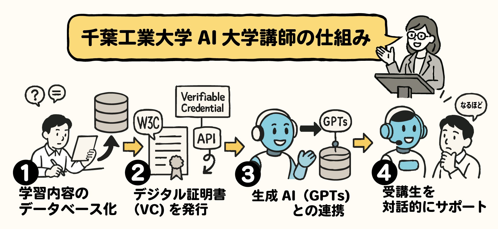 高等教育は知識獲得から創造的思考育成へとパラダイムシフトしています。「AI大学講師」は単なる自動応答ツールではなく、学生一人ひとりの思考プロセスを理解し、個別最適化された学びを促進するパートナーとなります。Verifiable Credentialによる学習記録は、学生が自身の成長を客観的に把握するだけでなく、社会に出た後も能力を証明する手段となるでしょう。AIはあくまで教育支援ツールであり、教員がより創造的な教育活動に集中できる環境を整えることが本プロジェクトの目的です。千葉工業大学並びに変革センターは今後も、テクノロジーと人間の共創による新たな教育モデルの構築に挑戦し、この実証実験を通じて日本の高等教育全体の発展に貢献していきます。