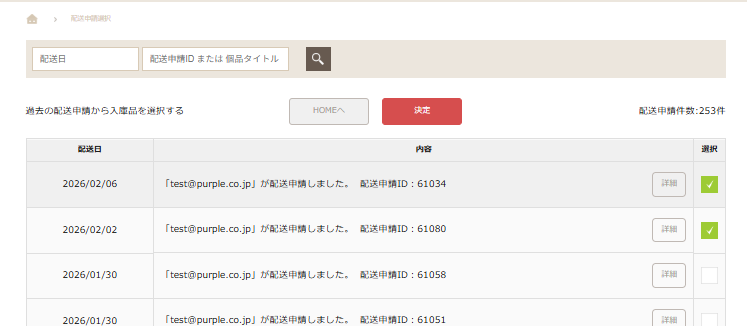 過去の配送申請一覧から選択可能