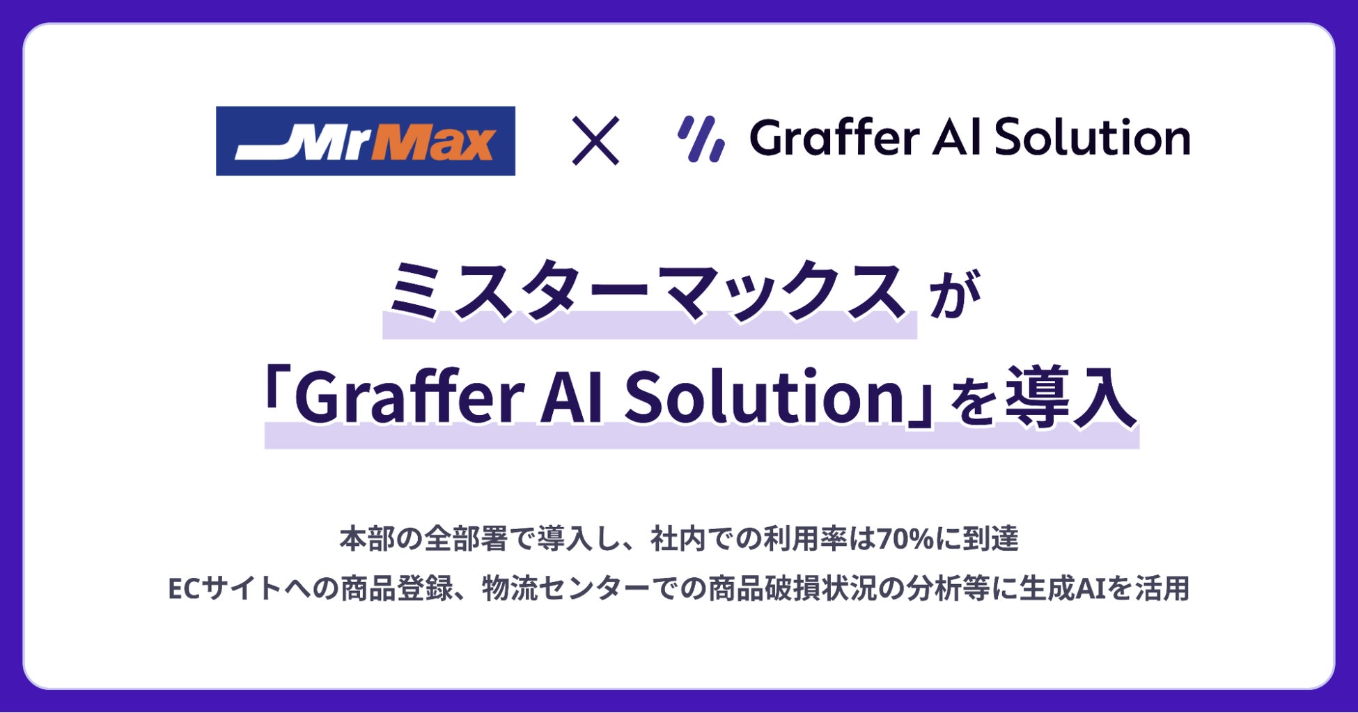 株式会社グラファー(本社:東京都渋谷区、代表取締役:石井大地、以下「当社」)は、株式会社ミスターマックス・ホールディングス(本社:福岡県福岡市東区、代表取締役社長:平野 能章、以下「ミスターマックス」)が生成AI活用による企業変革を実現する「Graffer AI Solution」を導入したことを発表します。ミスターマックスでは、その中核プロダクトである「Graffer AI Studio」をECサイトへの商品登録や、物流センターでの商品破損状況の分析等に活用し、社内利用率が70%に到達しました。当社は、企業の抱える課題分析や生成AI活用に適した業務の選定、運用設計、社員向け事例共有会の実施などを通じて包括的に支援し、ミスターマックスのさらなるイノベーション創出とお客さま体験価値の向上に貢献します。