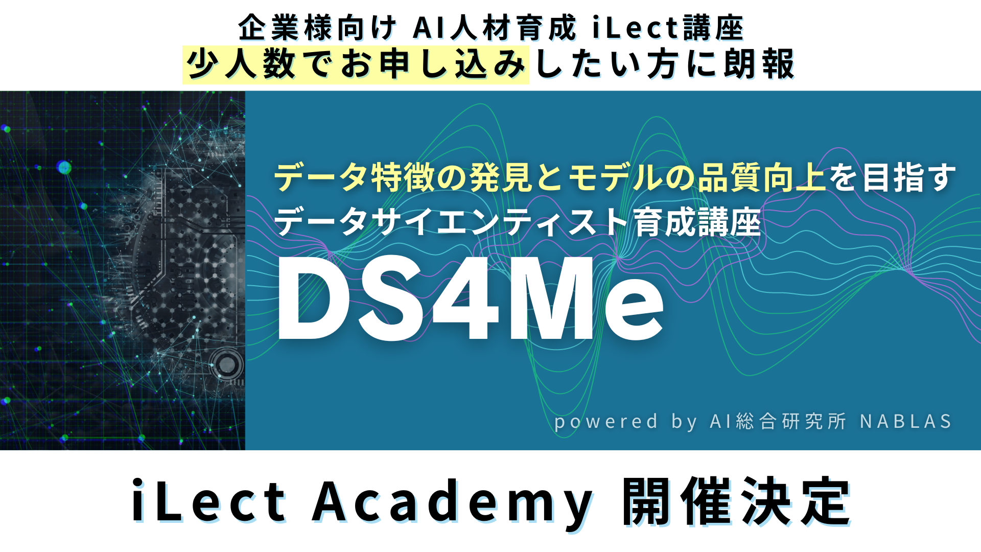 AI総合研究所として活動するNABLAS株式会社 (本社 : 東京都文京区本郷、 代表取締役 社長 : 中山 浩太郎、 以下「当社」)が提供する、実課題の解決を目的としたAI人材育成サービス iLect は、この度、データサイエンティスト育成講座【DS4Me】複数社合同講座 iLect Academy の開催が決定しました。