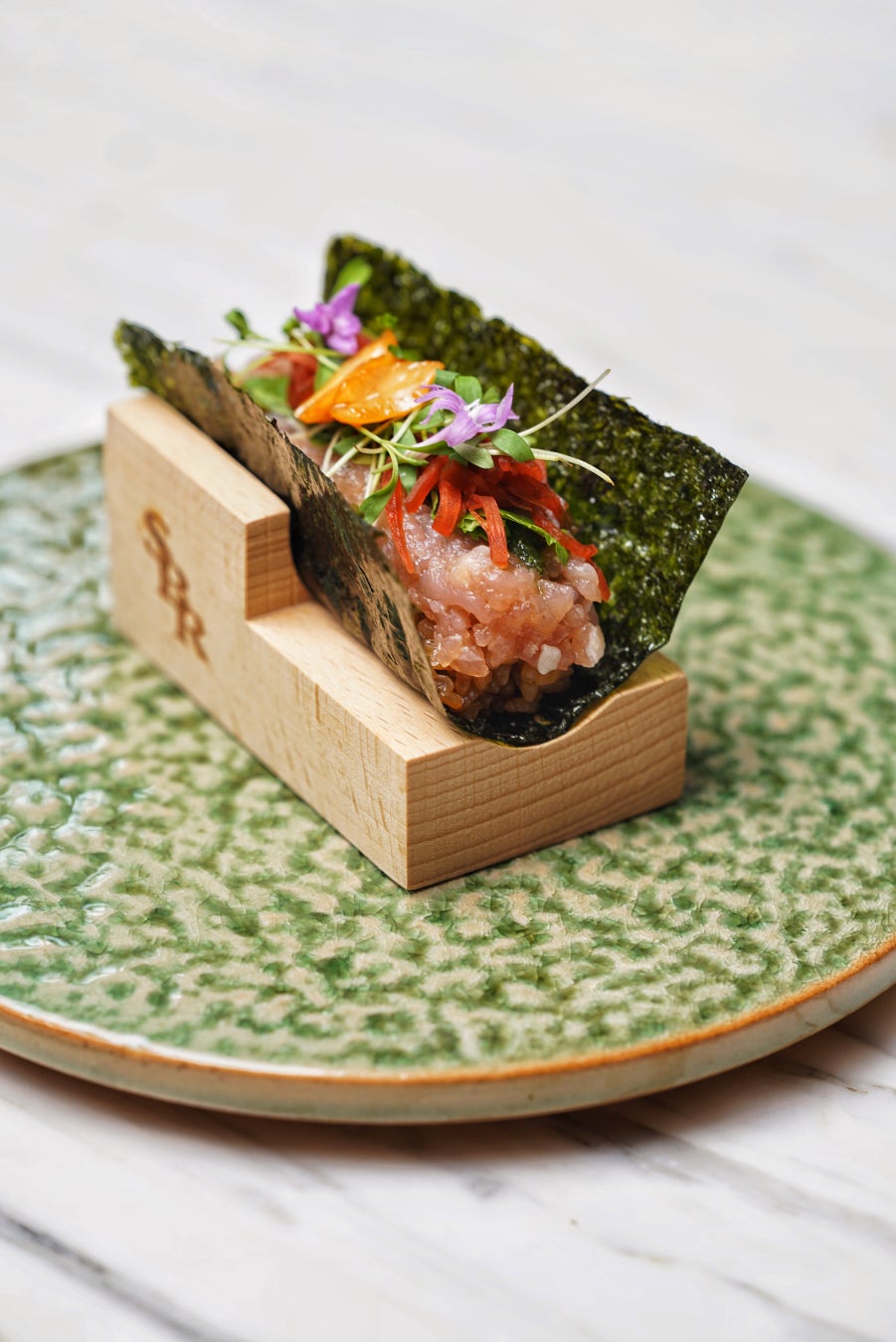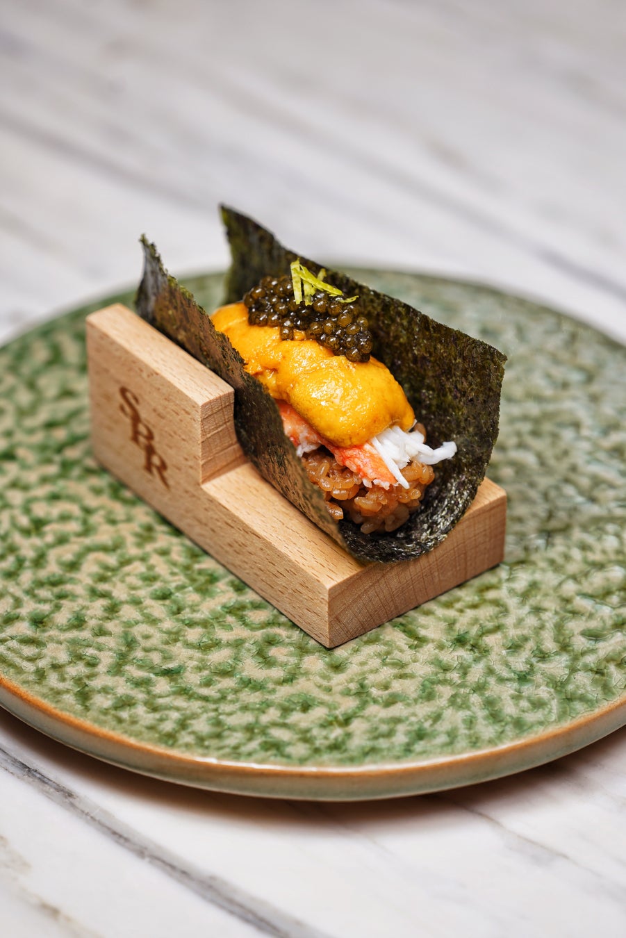 奥に続く「Sober Izakaya 居酒屋」は、The Bellwood 寺井彩花監修の手巻寿司がメインの寿司居酒屋。ナンプラーとハーブの香る「ホーチミン」や、火鍋風味の「成都」など、創作手巻寿司で世界の料理を表現しています。ドリンクはハイボールやワインを中心に、日本酒の飲み比べも可能。