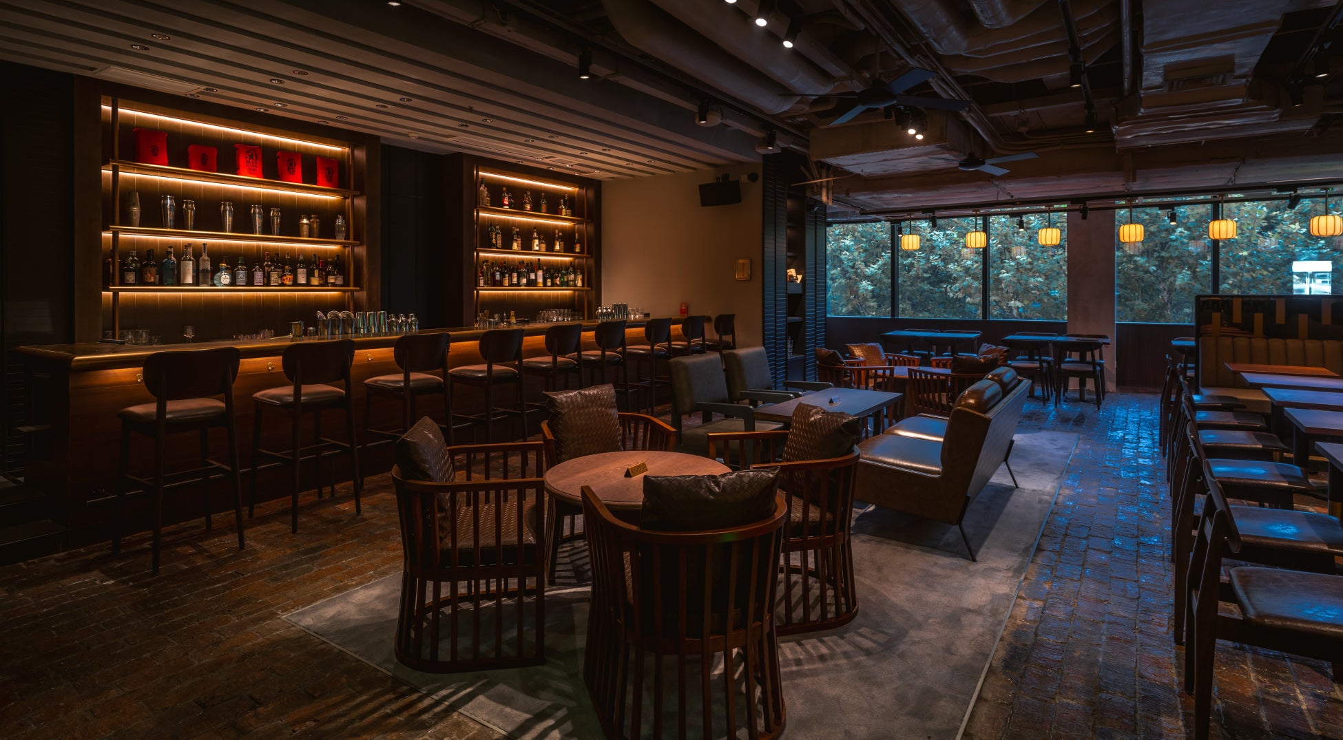 この度のリニューアルで移転先に選んだのは上海で注目の新施設「INS」。HIPHOPやテクノなど多ジャンルのクラブや劇場が入居し、昼夜人々が集うポップカルチャーの発信地です。Sober Companyは2フロアにわたり、路面の1階はテラス席で公園の噴水を望み、2階からは樹々の緑を見下ろせるロケーションです。