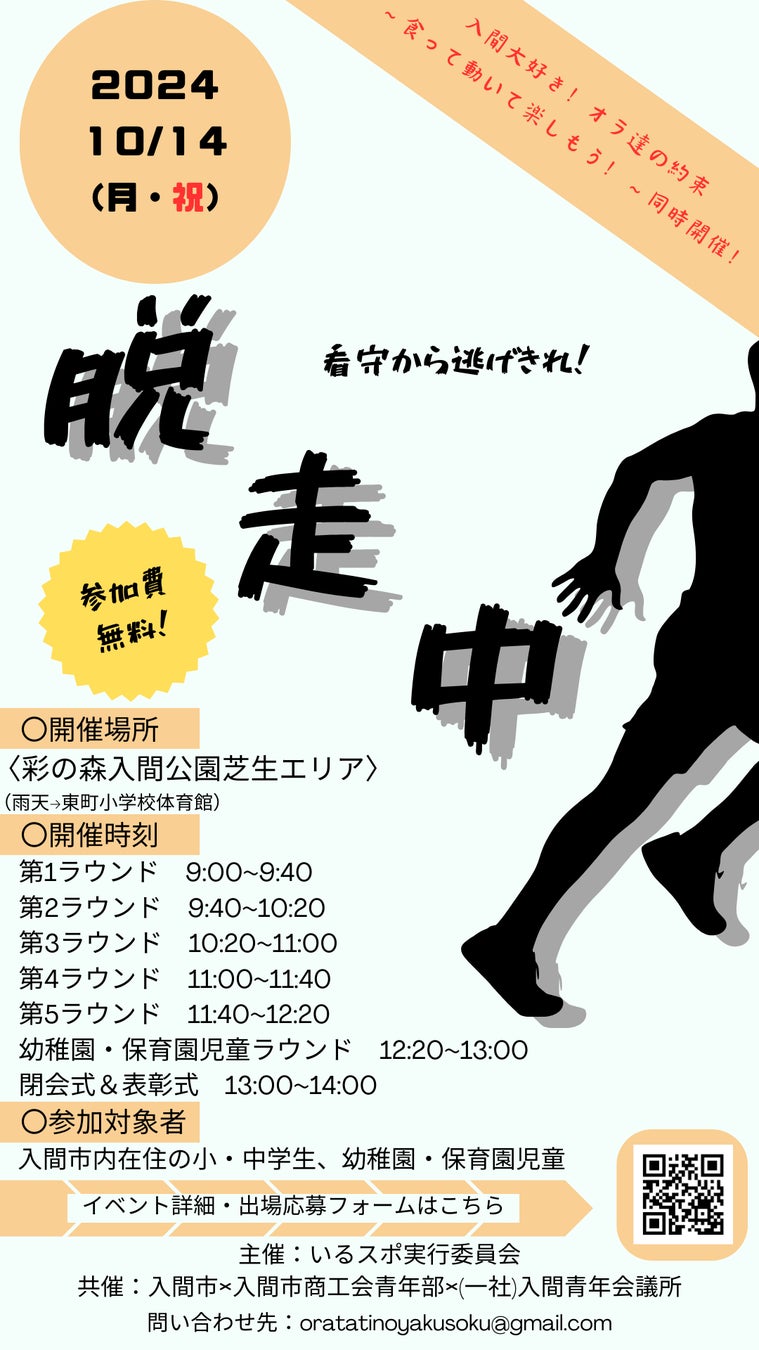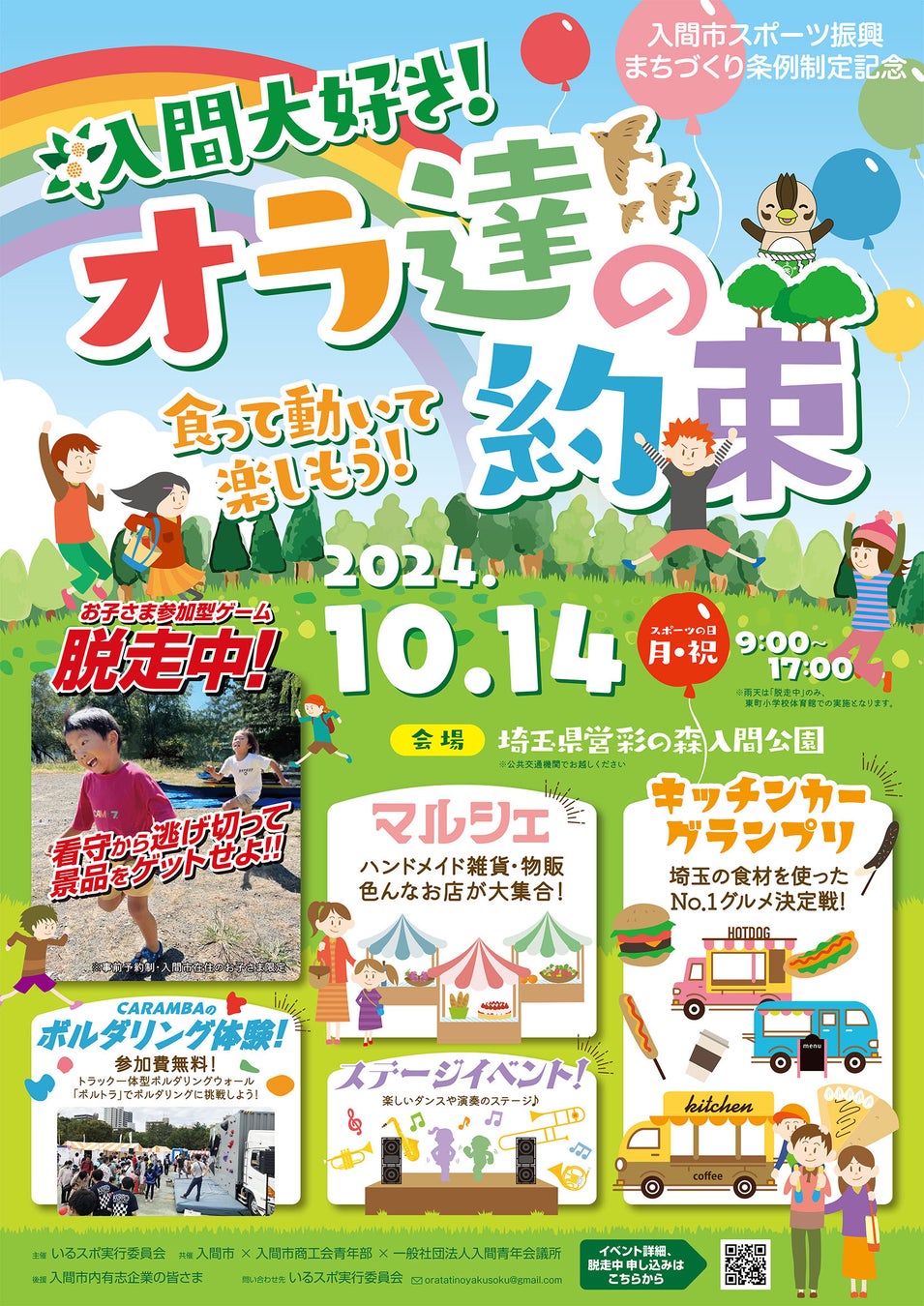 10月14日(月・祝)、彩の森入間公園の芝生広場を舞台にした大規模な鬼ごっこイベント、多目的広場でボルダリング体験・キッチンカー出店・マルシェ・ステージイベントを開催します。