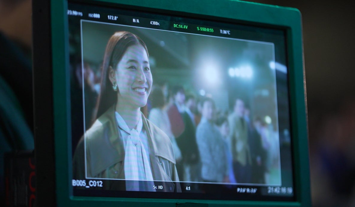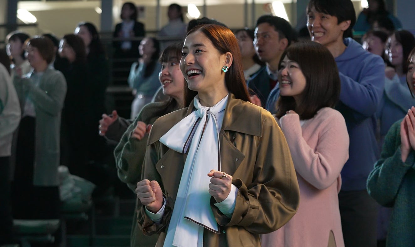 2月中旬、雨が降り凍えるような寒さの中、大井競馬場のスタンドで撮影に臨む新木さん。トレンチコートに薄手ニットのセットアップといった春の装いを身にまとい、大歓声をあげる大勢のエキストラたちに囲まれながら、遠距離恋愛中で、1,000km離れた地方都市からオンラインでレースを視聴している彼氏役の福士さんに、「観てる?」と訴えかけるシーンの撮影中。一部のエキストラが、レースを観戦し盛り上がる演技に熱演するあまり、監督の「カット!」の声がかかっても、「うぉ~~!」と声を出し続けます。すると静かになった競馬場にその声が響き渡り、現場が笑いに包まれました。つられて、新木さんも思わず「すごい!」と呟き、クスっと笑みをこぼしました。
