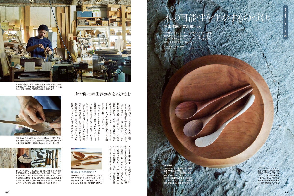 本特集では、熊本県で小国杉を使った地域活性の拠点として注目される「喫茶 竹の熊」といった事例紹介はじめ、身近におきたい木のアイテムやアロマ、森林を生業にする方々など、幅広くご紹介。