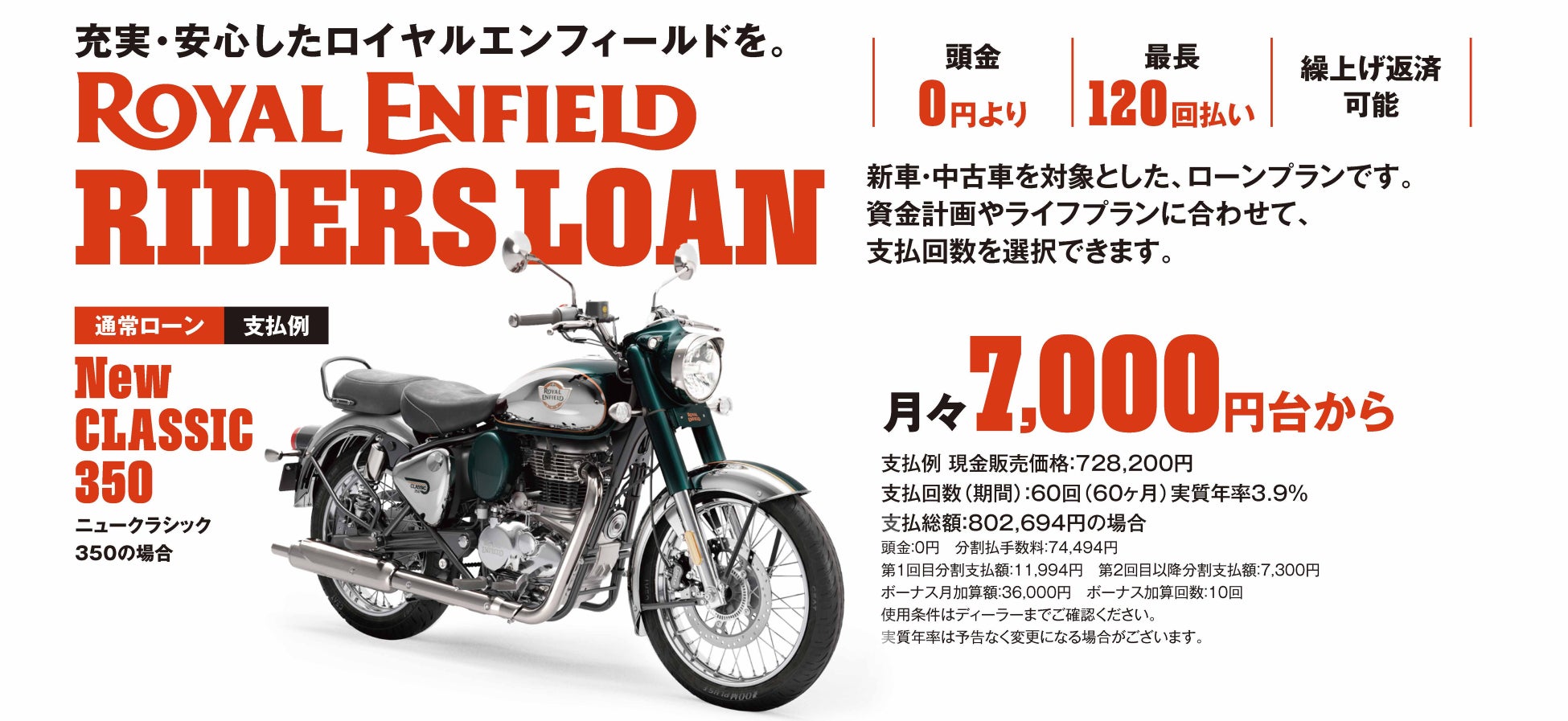 ロイヤルエンフィールド・ライダースローンは、新車・中古車を対象として支払い回数を選択できる