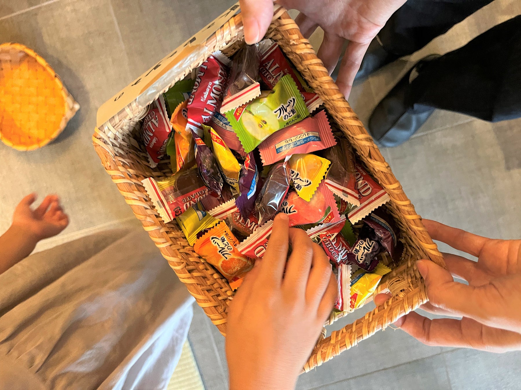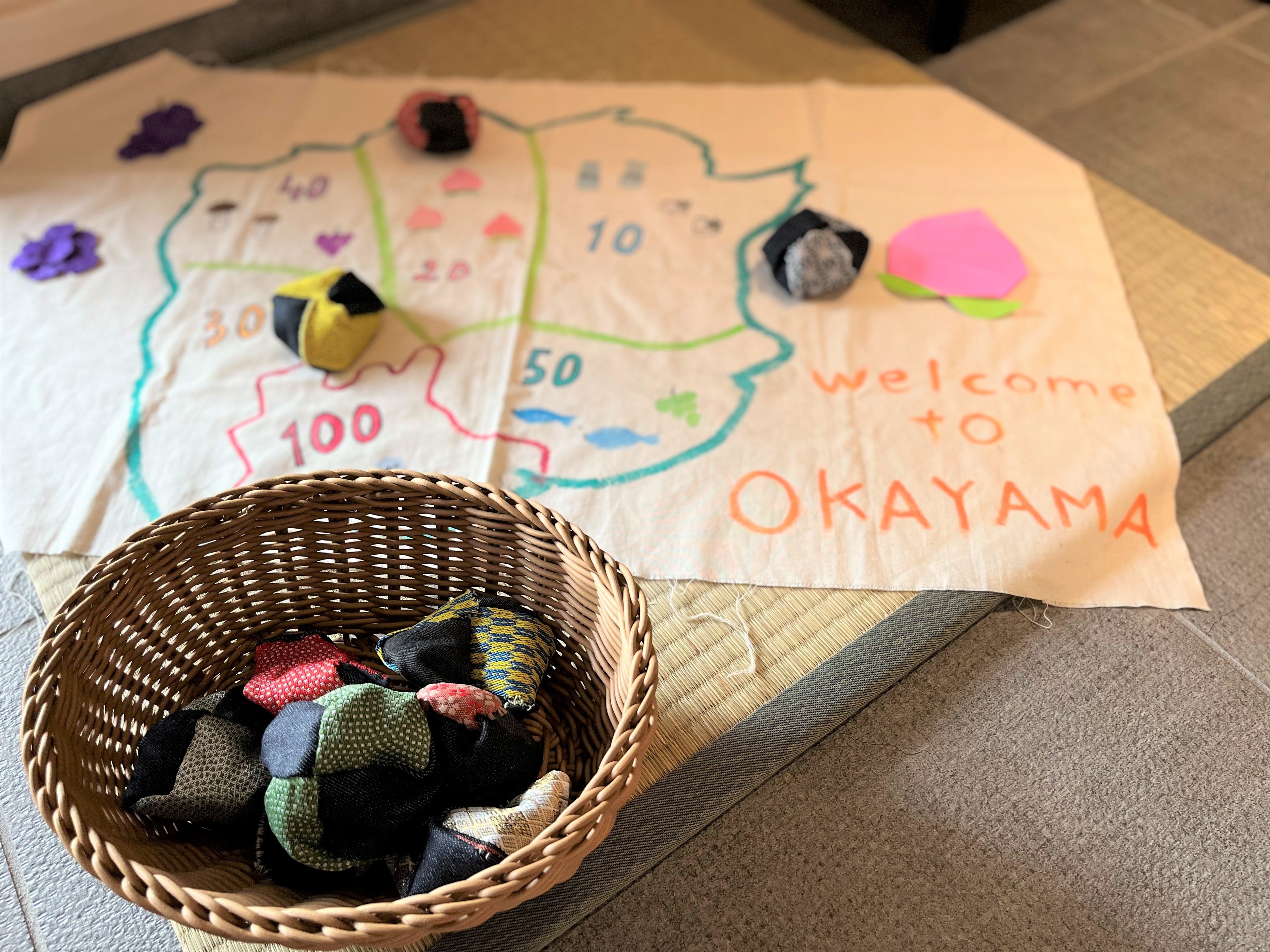 倉敷名産の畳縁とデニムを使って手づくりしたお手玉を的に向かって投げる遊び。