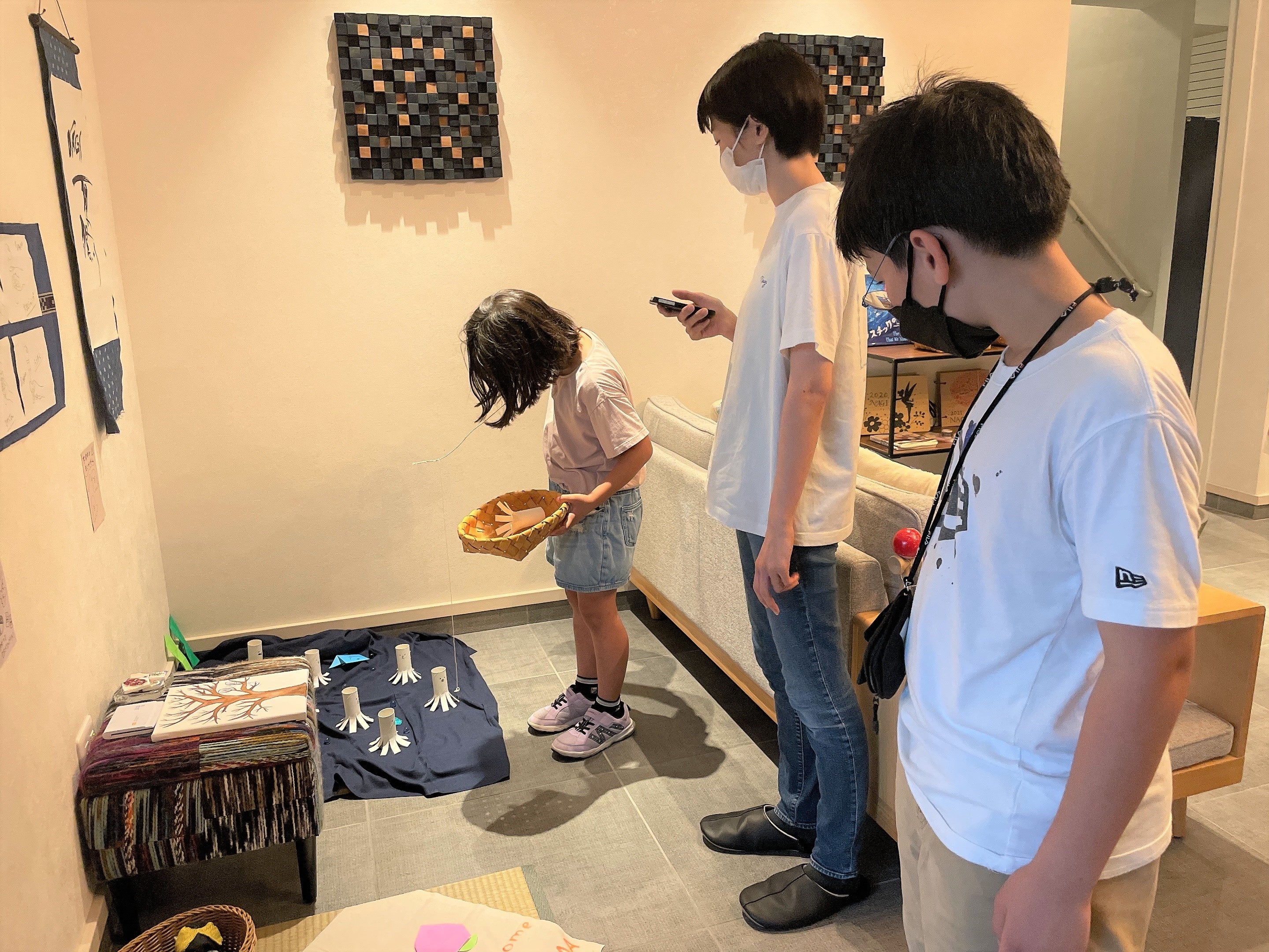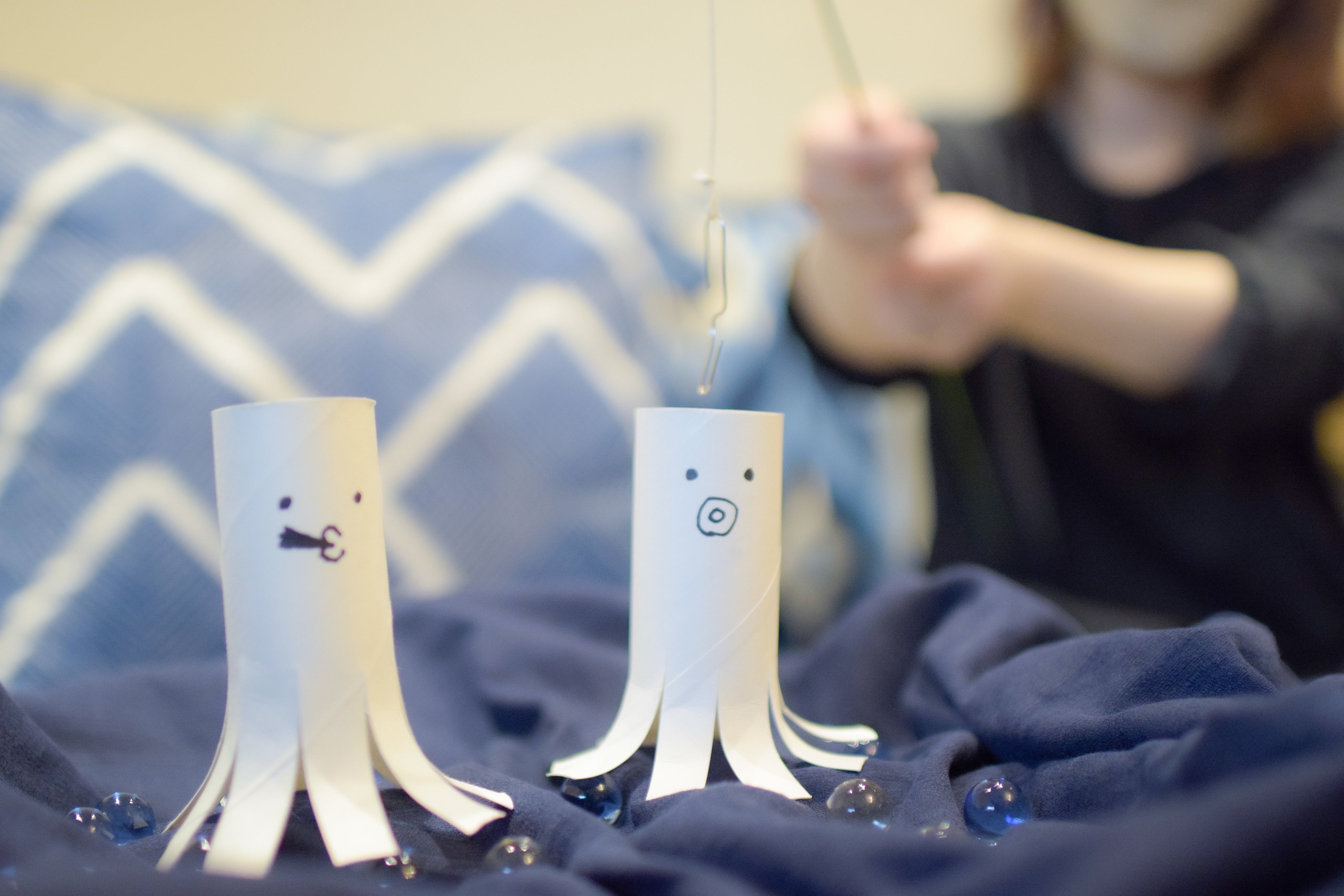 トイレットペーパーの芯をリサイクルして作ったタコを釣っていただく遊びです。
