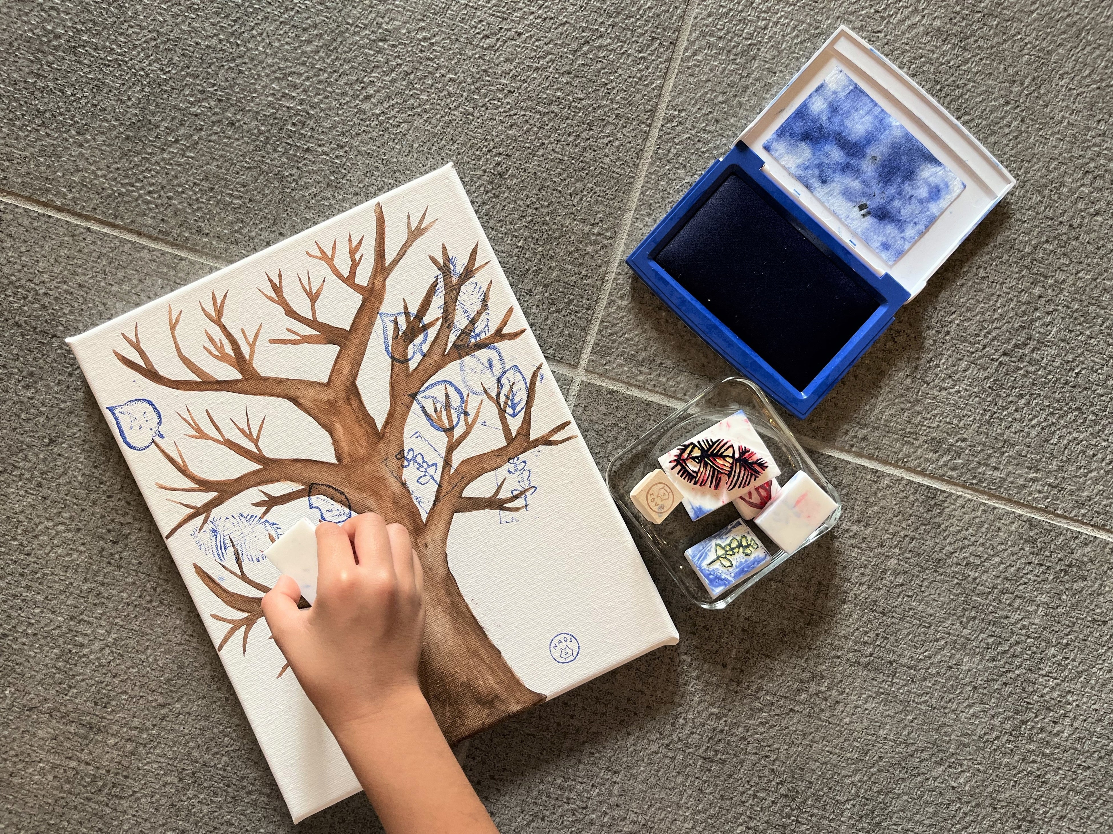 用意した布に、宿泊者全員がスタンプを押していき、一つのアートを完成させる。