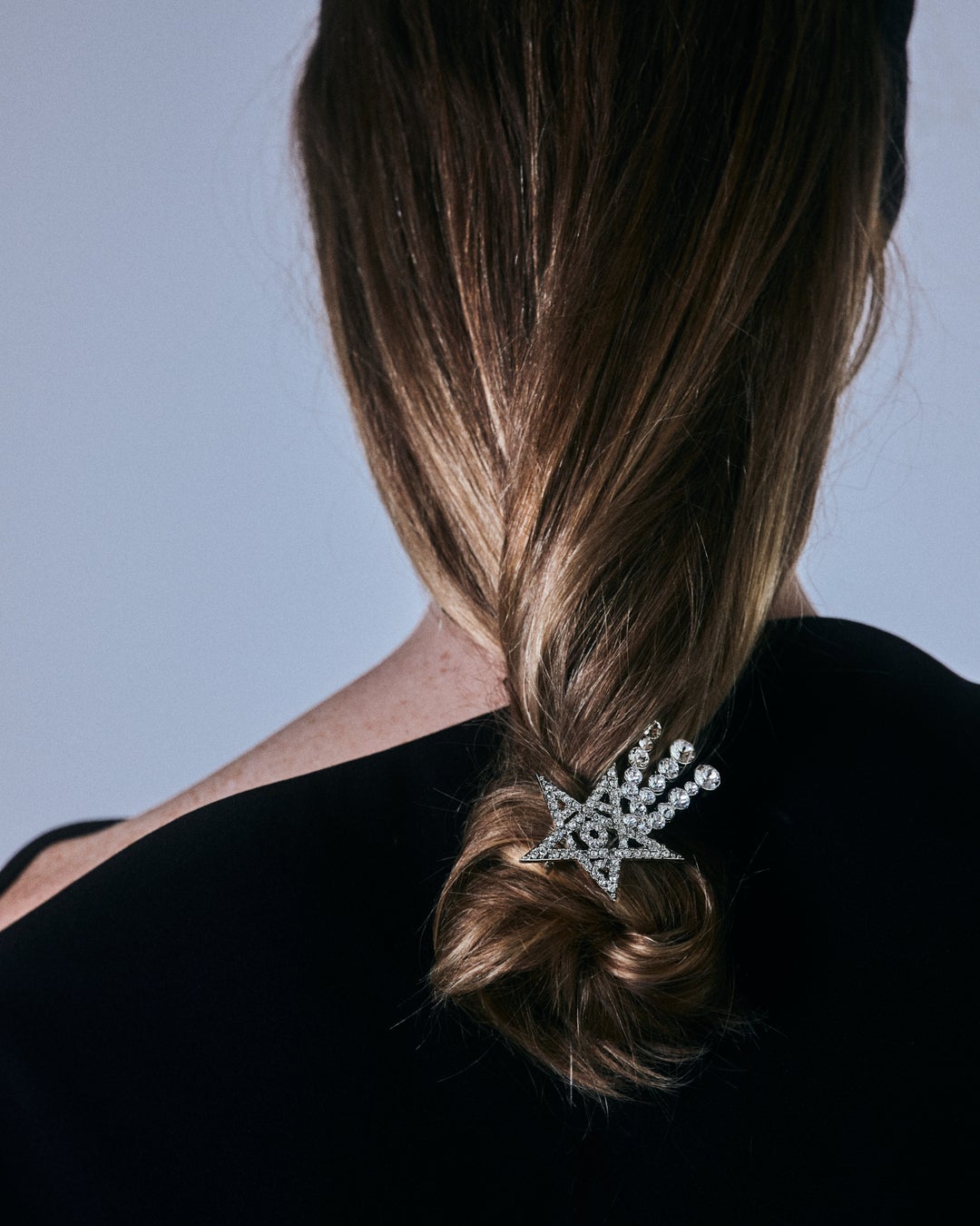 空想の夜空を流れる星のように、ガラスが華やかにきらめき、纏う人の夢を映し出してヘアスタイルに詩的な気配を宿します。