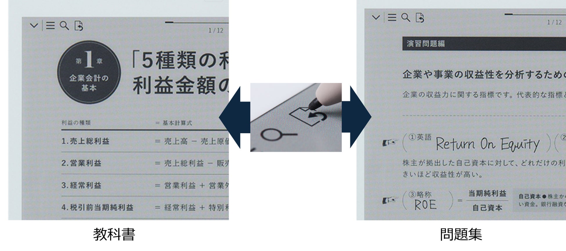 本物の紙とペンのような“書きやすさ”と“読みやすさ”を実現したクアデルノは“薄さ” “軽さ” “長時間駆動”が特長の電子ペーパーです。コンパクトなボディには、資料の取り込み・閲覧、手書きメモやPDFへの書き込みが可能で、一般的な大学ノート約20万冊分のデータを保存できます。実際の紙とは違い、何枚でも書き続けられ、間違ったらすぐに消せるなど、アナログの良さとデジタルツールの利便性を持ち合わせています。