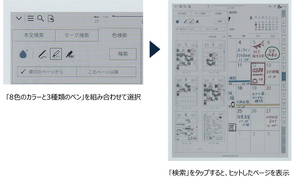クアデルノのカラーモデルでは、重要な情報を色分け記載して、管理することができます。今回新たに追加した「色検索」機能により、色分けしたデータから「ペン色」と「ペン種」で手書きデータの検索が可能になりました。カラーでの意味付けをおこない検索できるようになることで、学習利用では、試験に出る箇所や覚えきれていないポイントを色分けして管理して「色検索」機能を活用することで効果的に復習ができます。また、ビジネスシーンでは、よく使うタスクごとに色分けをしておくことで、スケジュール管理がおこないやすくなります。