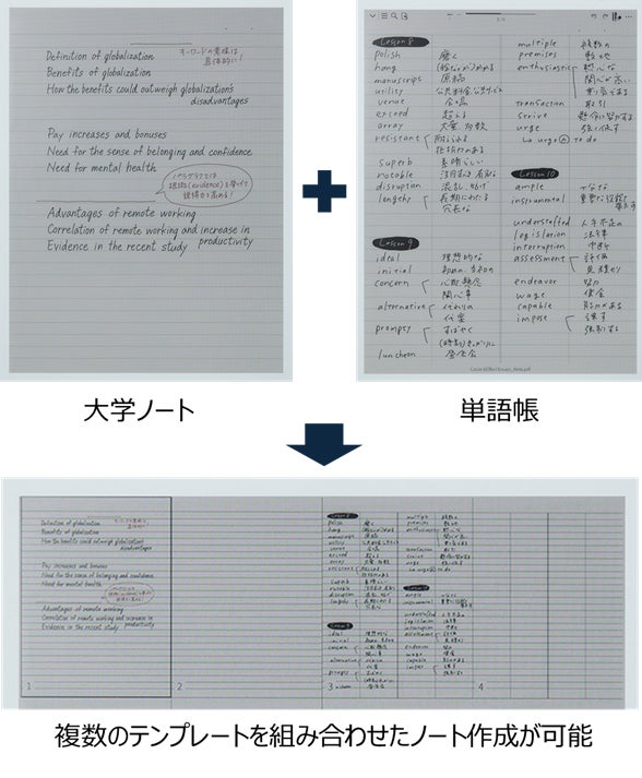 新規ページを挿入する際に、テンプレートを自由に選択できるようになりました。さらに、新規ページの挿入場所も表示しているページの前か後ろを選ぶことができるようになりました。例えば、英語学習時に大学ノートへの単語帳の挿入や、異なるビジネステンプレートの挿入など、別テンプレートの挿入対応により、使い方の自由度が上がり、学習の効率化、仕事での思考加速につながります。