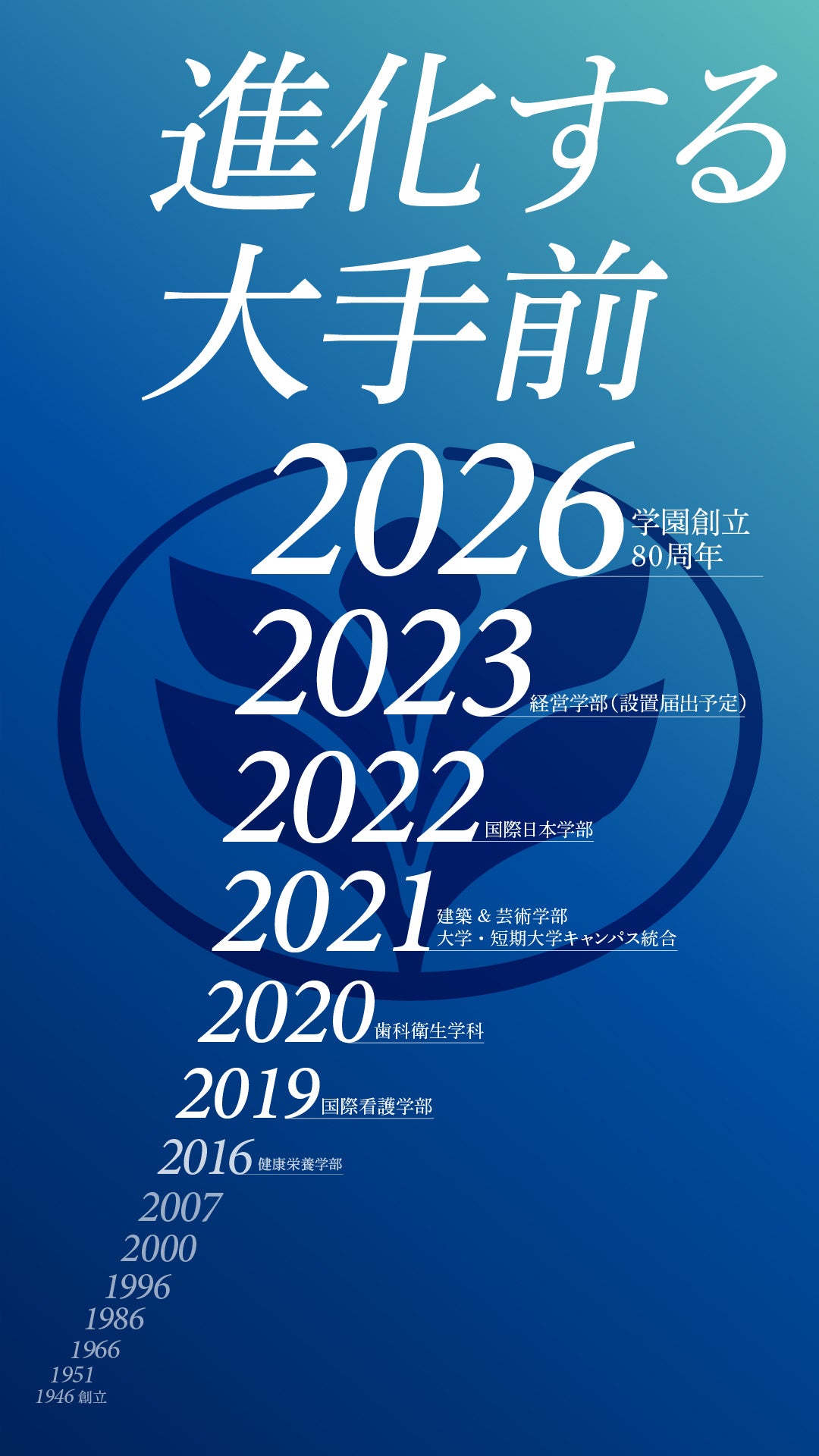 | 【大手前大学】 学長 :鳥越皓之 設立年度 :1966年 キャンパス :さくら夙川キャンパス、大阪大手前キャンパス 学部(学科) :総合文化学部※1(総合文化学科) 、建築&芸術学部(建築&芸術学科) 現代社会学部 (現代社会学科) 、経営学部※2 (経営学科) 健康栄養学部 (管理栄養学科) 、国際看護学部 (看護学科) ※1・・・2022年4月、「総合文化学部」は「国際日本学部」に学部名称変更 ※2・・・2023年4月、経営学部開設予定(設置届出予定) 通信教育課程 :現代社会学部 (現代社会学科) 大学院 :比較文化研究科 国際看護学研究科 修士課程(仮称)※3 ※3・・・2023年4月、国際看護学研究科 設置構想中 学生数 :5504人(2021年5月1日現在) 大学webサイト:https://www.otemae.ac.jp/ 受験生サイト :https://www.otemae.ac.jp/examinee/index.html Twitter :https://twitter.com/otemae_univ Instagram :https://www.instagram.com/otemae_univ/ Facebook :https://www.facebook.com/otemaeUniv LINE@ :https://page.line.me/bec6240f |