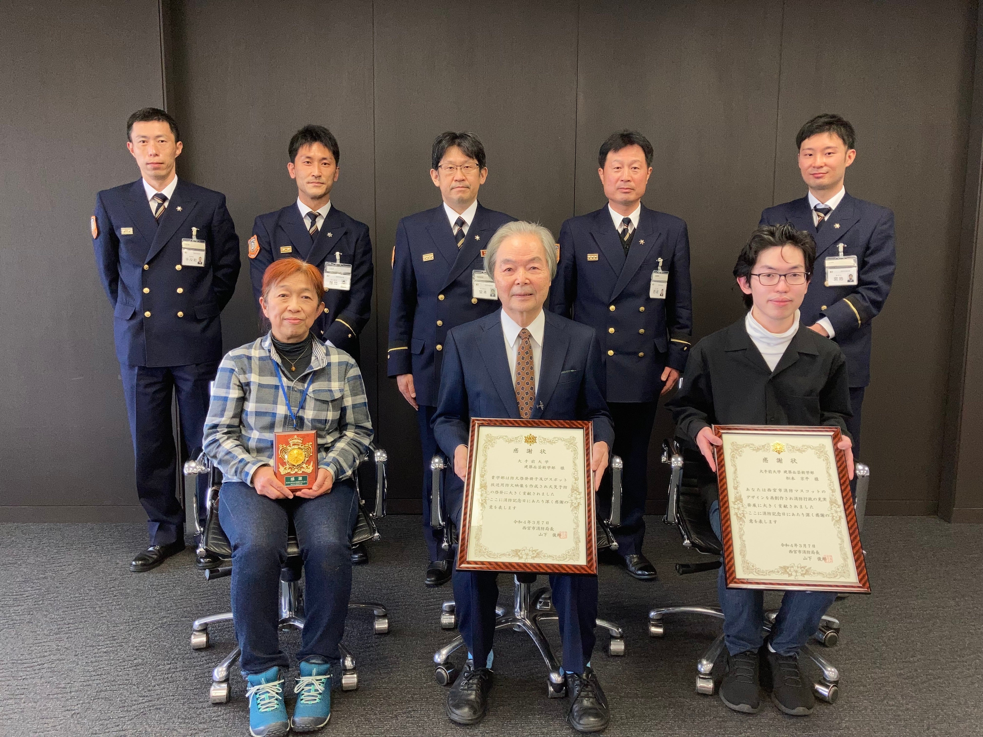 大手前大学(本部:大阪市中央区、理事長:福井要、学長:鳥越皓之、以下「本学」) は、2022年3月9日(水)西宮市消防局より消防行政の推進功績に対し、個人表彰、団体表彰を受け感謝状が贈呈されました。