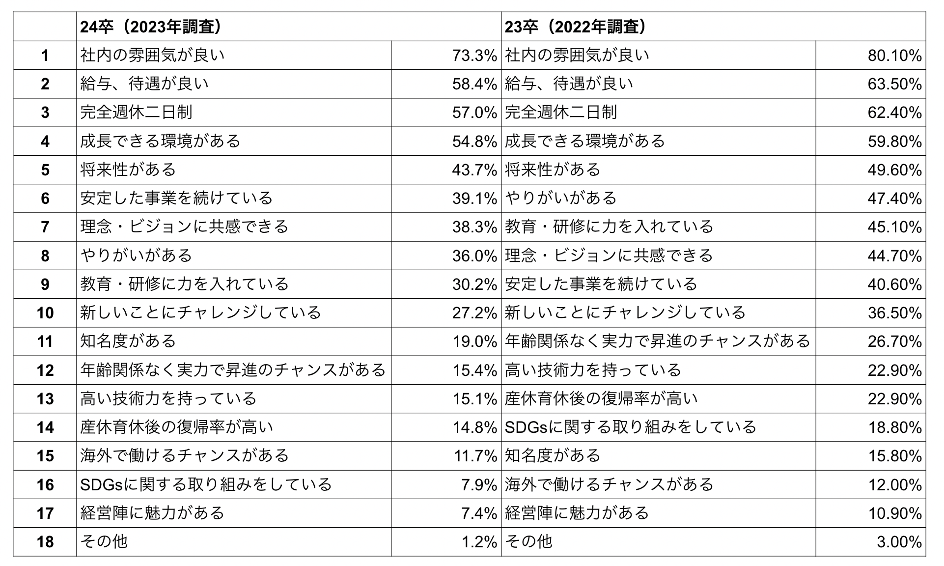 23卒学生対象に昨年実施した調査と24卒学生を対象とした今年の調査をランキング形式で発表いたします。