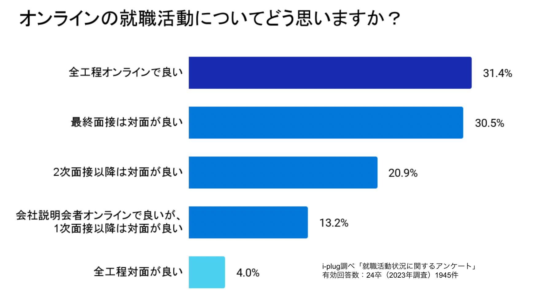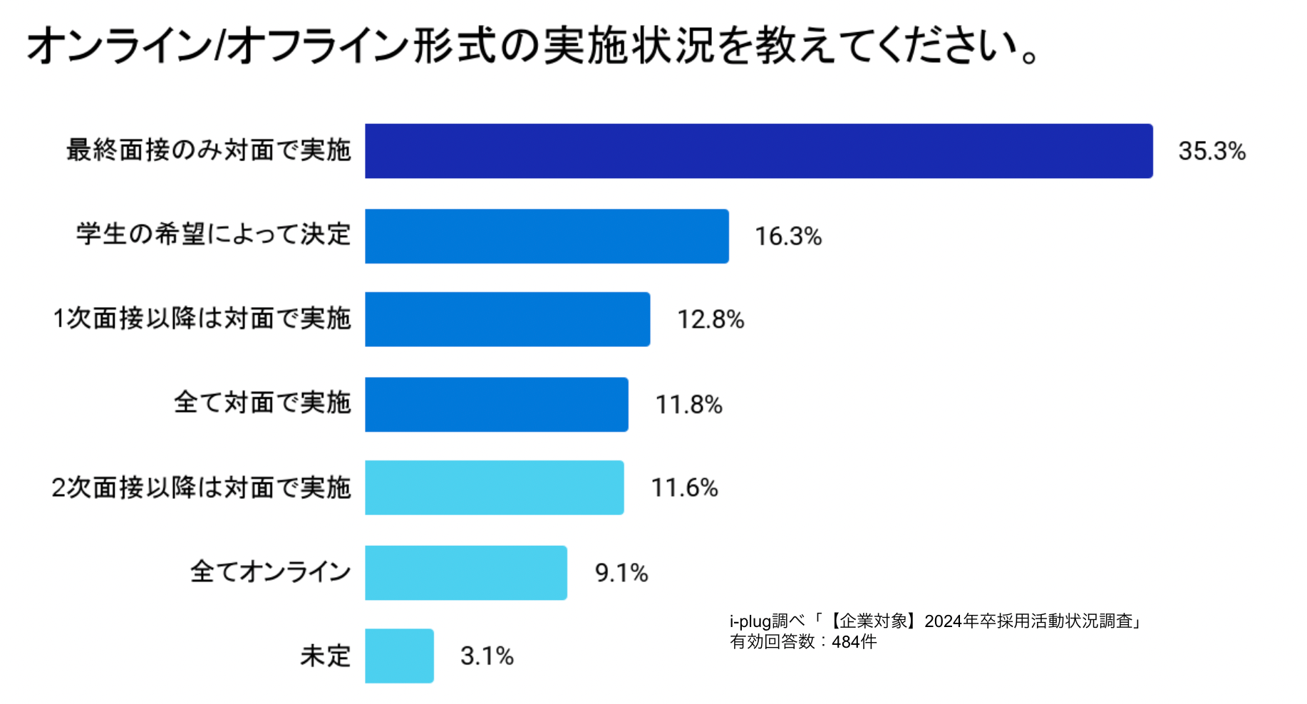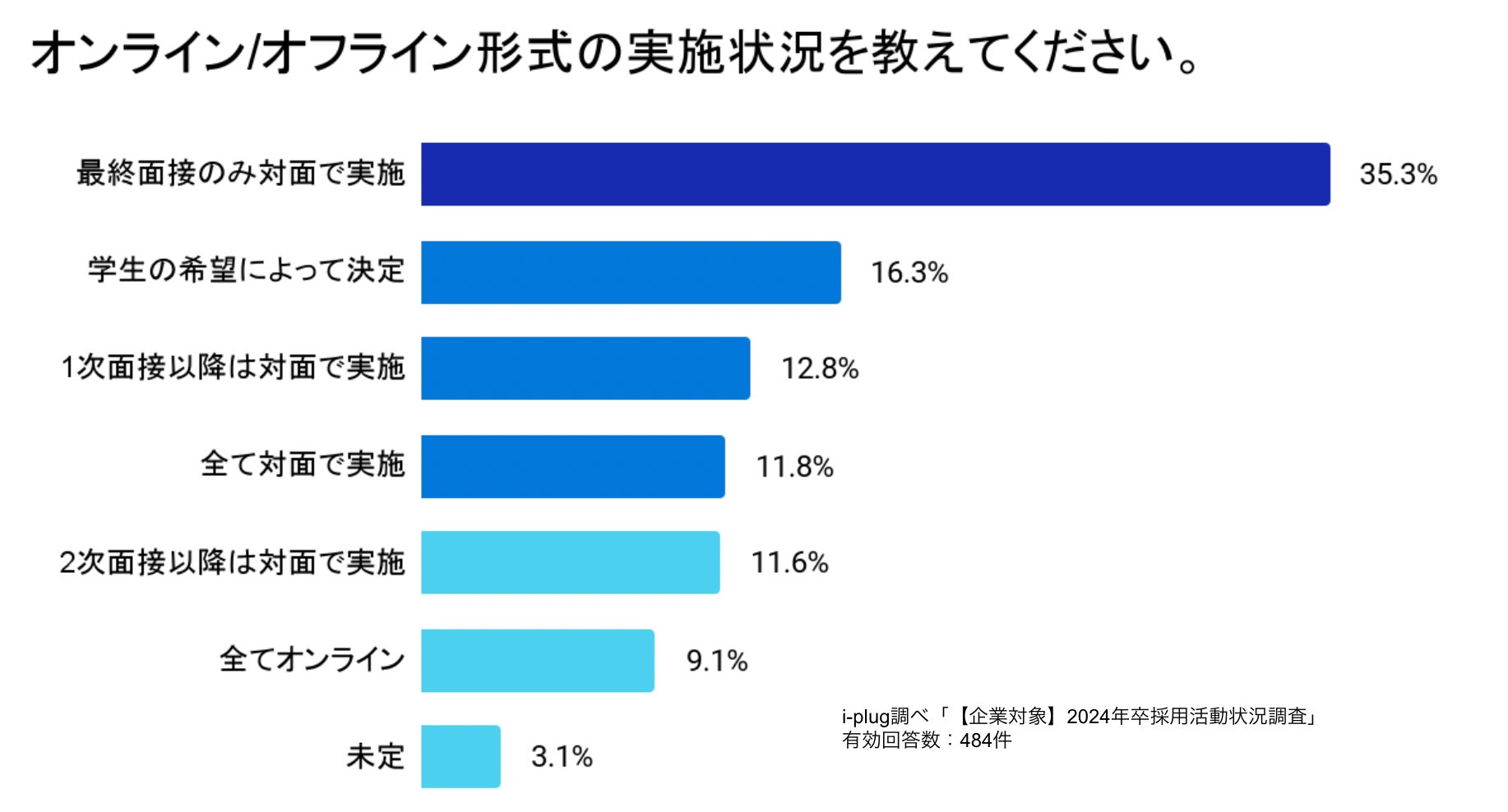 「全てオンラインが良い」が24卒学生対象の調査では最多でしたが、「全てオンライン」で採用を実施する企業はわずか9.1%でした。