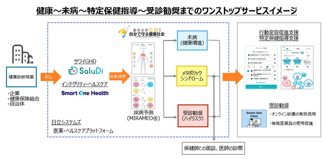 今回、株式会社日立システムズの医薬・ヘルスケアプラットフォーム上で、健康管理PHRアプリケーション「SaluDi」(サワイグループホールディングス株式会社/以下、サワイグループホールディングス)およびPHR管理システム「Smart One Health」(株式会社インテグリティ・ヘルスケア/以下、インテグリティ・ヘルスケア)と東京大学COI個別化保健医療講座(岸暁子特任助教)開発の行動変容促進システム「MIRAMED®」(*1)を活用した特定保健指導を連携させ、「健康~未病~特定保健指導~受診勧奨のワンストップサービス」の実現可能性や効果の検証を行います。「MIRAMED®」での保健師・薬剤師による特定保健指導後にAIが継続指導できる機能を搭載するなど機能アップデートの検討を日立システムズが行い、生活習慣病の発症リスクが高いといわれるメタボリックシンドローム対応、オンライン指導の有効活用を図ります。