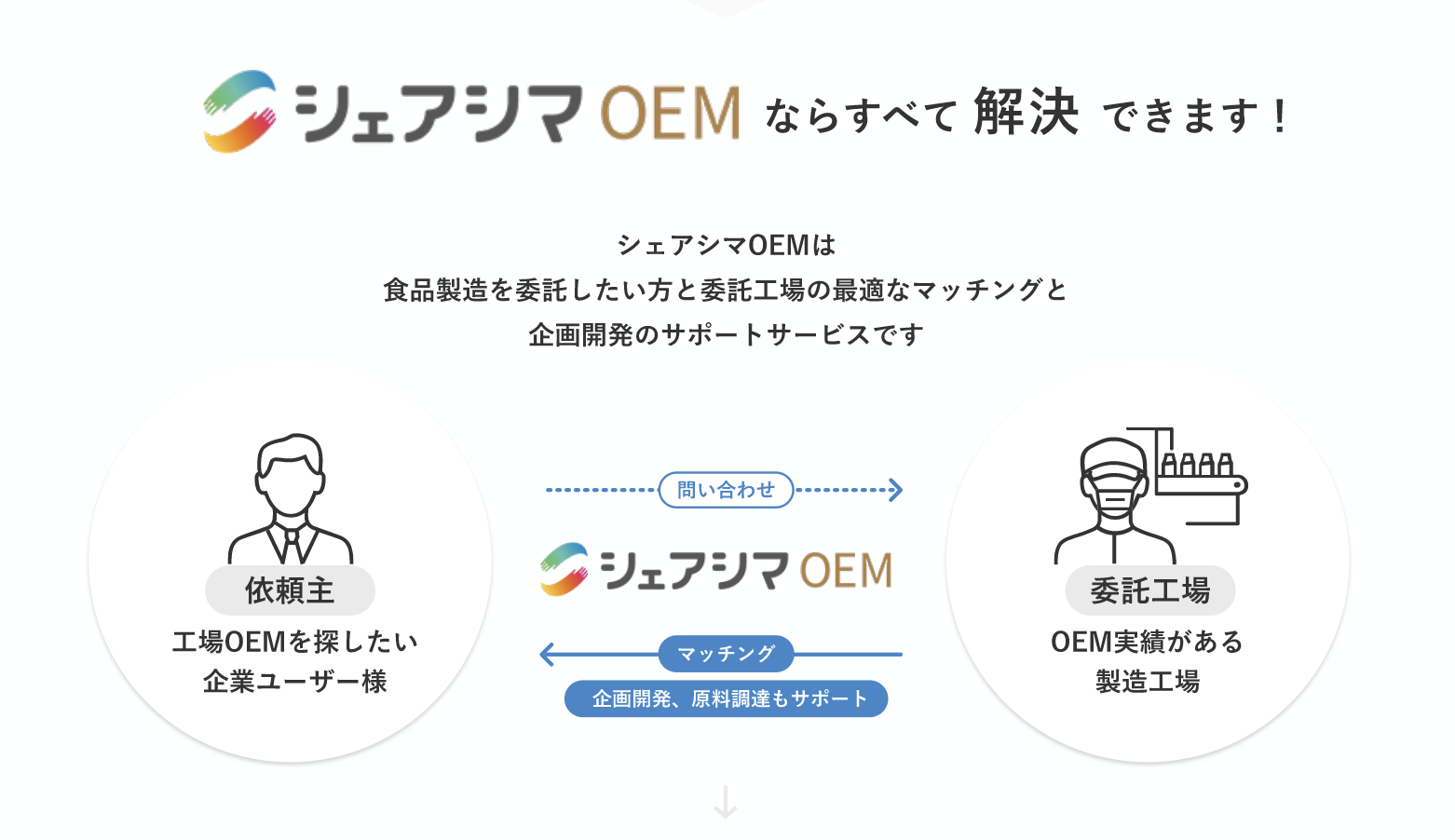 「シェアシマOEM」は、食品開発に関わるお悩みを解決するサポートサービスです。