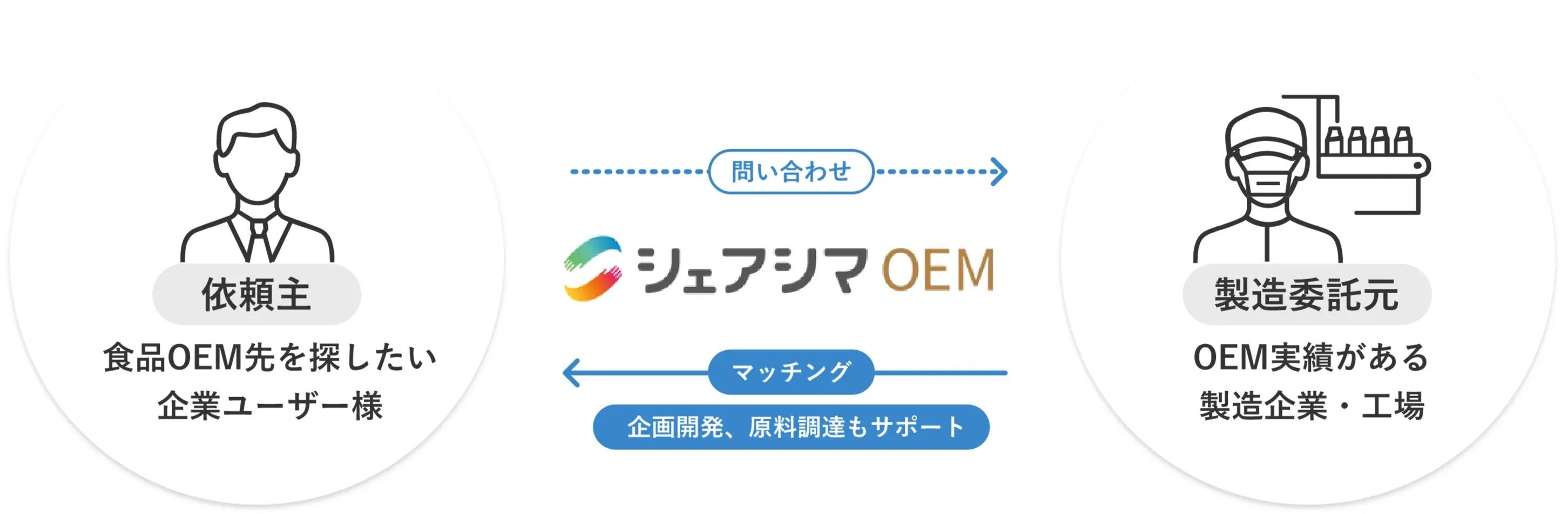 「なんとか、この商品開発にかかる時間や手間を減らすことはできないか?」そして「実績があり安心して食品製造を任せられる工場を見つけ製造委託できないか?」という、新商品を外部委託する皆様のニーズにお応えするべく「シェアシマOEM」をスタートさせました。