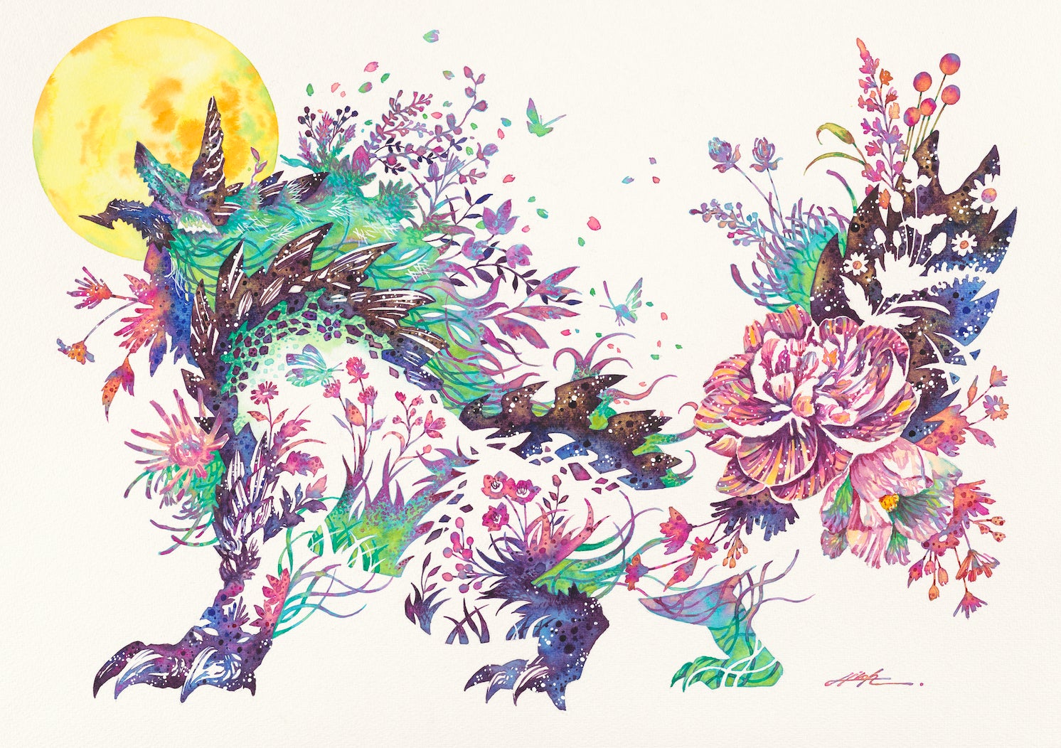 咆哮に合わせて花弁が舞う躍動感や影に花の描き込むことで地面を表現するなど、ゲームの世界感を保ちつつ「タケダヒロキ」の鮮やかな色彩の草花と動物を融合させる手法が結びついた、20周年をお祝いするに相応しい華やかで幻想的な作品となりました。