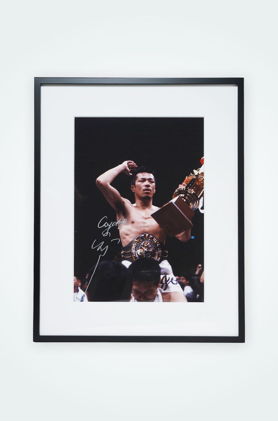 今回のポップアップ開催に伴い、ボクシングマガジンの編集部に保管されているアーカイブの中から、デビュー当時やベルト奪取時のワンシーンを収めた貴重な写真を厳選して展示いたします。また、膨大なアーカイブの中から本人がセレクトした3種類を額装し、本人の直筆サイン入りにて100枚限定で販売いたします。