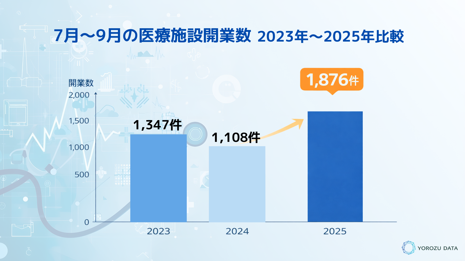 2025年7月〜9月に開業した全国の病院・診療所1,876件のデータを分析した結果、医療機関の新規開業は「春に集中する」従来型から、「時期が分散する」局面へと移行している実態が明らかになりました。