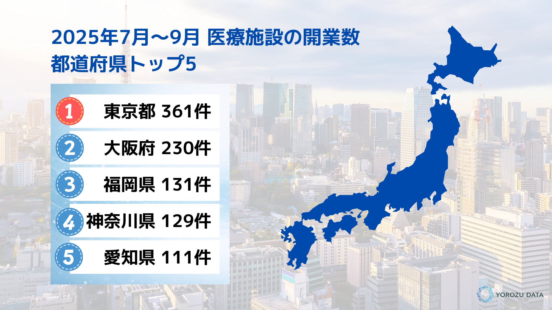 2025年7月〜9月の医療機関開業数を都道府県別に見ると、東京都(361件)、大阪府(230件)、福岡県(131件)、神奈川県(129件)、愛知県(111件)といった都市部・中核都市圏が上位を占めました。