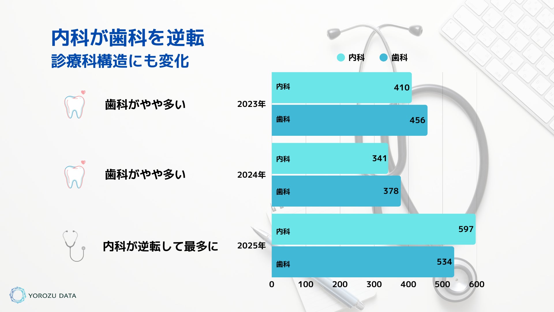 さらに、これまで歯科が優勢だった診療所開業において、2025年は内科が逆転するなど、診療科構造にも変化が確認されています。