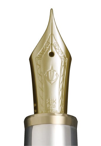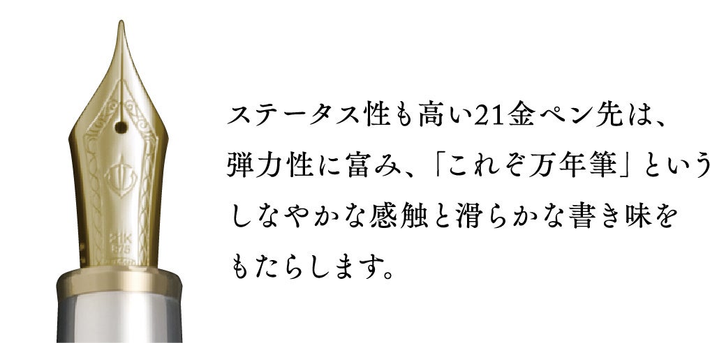万年筆のペン先として多く使われている14金や18金に比べて弾力をもたせており、筆圧が強くかかったときでもペン先の切り込みが開くことなく、インク切れが起こりにくくなります。“しなる”ように紙面を滑り、常に安定したインク供給で“フェザータッチ”とも言われる快適な書き味が楽しめます。