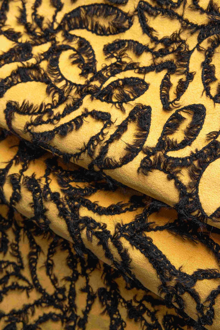 マテリアルの表面に色とりどりのフリンジやゴールドのビーズ、ガンメタルグレーのスタッズがあしらわれたものなどもあり、ALCANTARA®が新しいテクノロジーを用いたデザインの土台にもなっています。