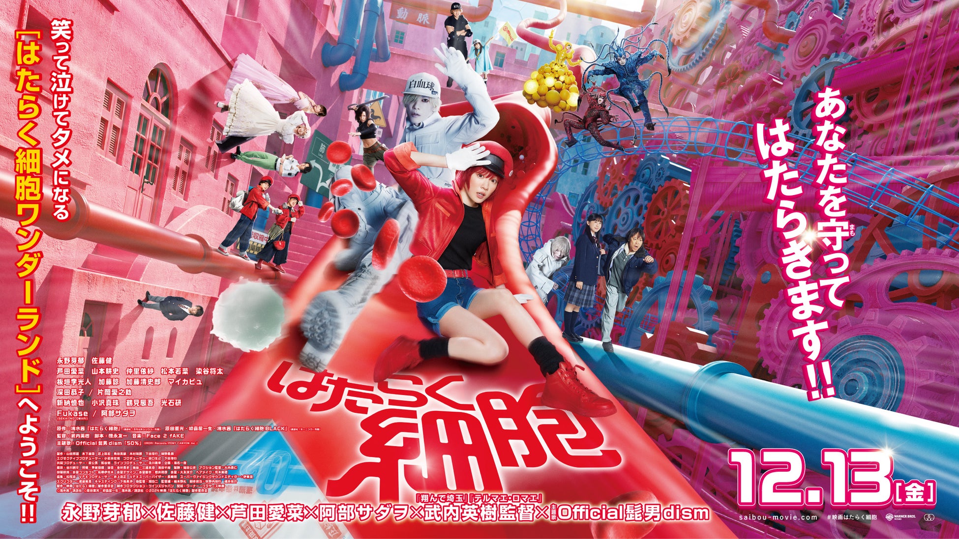 細胞を擬人化したマンガ『はたらく細胞』(清水茜・講談社「月刊少年シリウス」所載)。連載開始から話題沸騰、瞬く間に大人気。アニメ化や多くのスピンオフ作品、関連書籍を生み出すなどその勢いはとどまることを知らず、シリーズ累計発行部数1000万部を超えるメガヒットを記録。そして今回、ついに実写映画化が実現した。永野芽郁=赤血球・佐藤健=白血球(好中球)のW主演に加え、人間の親子役で芦田愛菜(漆崎日胡)・阿部サダヲ(漆崎茂)をはじめ、山本耕史(キラーT細胞)、仲里依紗(NK細胞)、松本若菜(マクロファージ)、マイカピュ(血小板)、染谷将太(ヘルパーT細胞)、深田恭子(肝細胞)、板垣李光人(新米赤血球)、加藤諒(先輩赤血球)、加藤清史郎(武田先輩)、片岡愛之助(肺炎球菌)、小沢真珠(黄色ブドウ球菌)、新納慎也(化膿レンサ球菌)、そしてSEKAI NO OWARIのFukaseが細胞たちの最強の敵として出演するなど超豪華キャストが勢揃い。監督はヒットメーカー武内英樹(『翔んで埼玉』『テルマエ・ロマエ』)。アクション演出は大内貴仁(『るろうに剣心』『幽☆遊☆白書』)。CG制作は日本最高峰の技術を持つ白組が担当。さらに主題歌はofficial髭男dismが『50%』を書き下ろし。日本エンタメ界を代表するドリームチームが、誰も見たことのない独創的でユニークな世界を作り上げる。映画館だからこそ楽しめる唯一無二の映像体験—笑って泣けてためになる【はたらく細胞ワンダーランド】へようこそ。この冬、あなたの体内が壮大な物語の舞台になる!