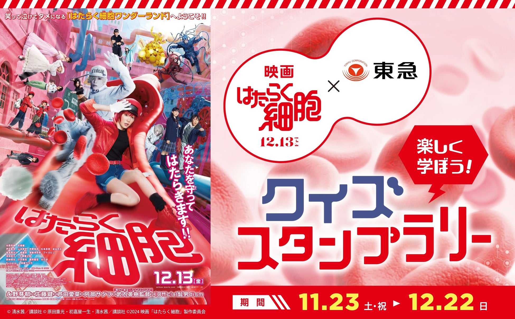 東急株式会社(以下、東急)、東急電鉄株式会社(以下、東急電鉄)、株式会社東急モールズデベロップメント(以下、TMD)は、映画『はたらく細胞』が本年12月13日(金)に公開されることにあわせ、本年11月からさまざまなコラボレーション企画(以下、本企画)を開催します。