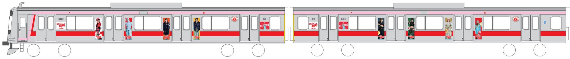 今回のコラボレーションを記念して、特別装飾のラッピングトレイン(以下、本列車)の運行を実施します。本作品のキャストが勢ぞろいした車体のオリジナルラッピングに加え、車内のジャック広告も実施し、車体・車内ともに本作品の世界観でカラフルに彩ります。