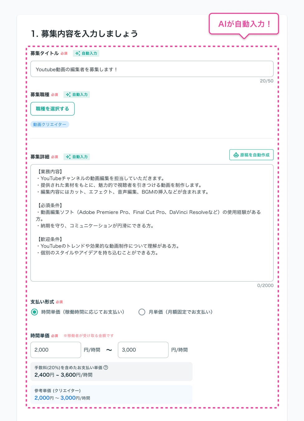 入力した一文をもとに、募集タイトル・職種・単価・募集詳細をAIが自動入力します。