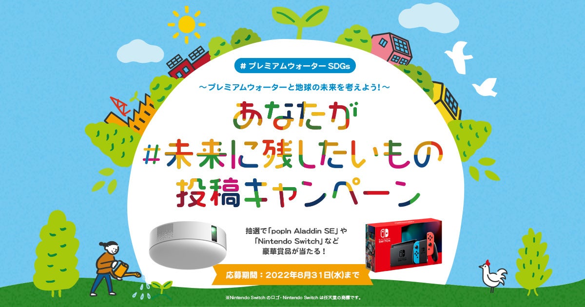『あなたが未来に残したいもの』をテーマに、「#プレミアムウォーター」「#未来に残したいもの」の2つのハッシュタグをつけてInstagramに投稿。素敵な投稿をしてくださった方の中から抽選で、「popIn Aladdin SE」や「Nintendo Switch」などの豪華賞品をプレゼントします!