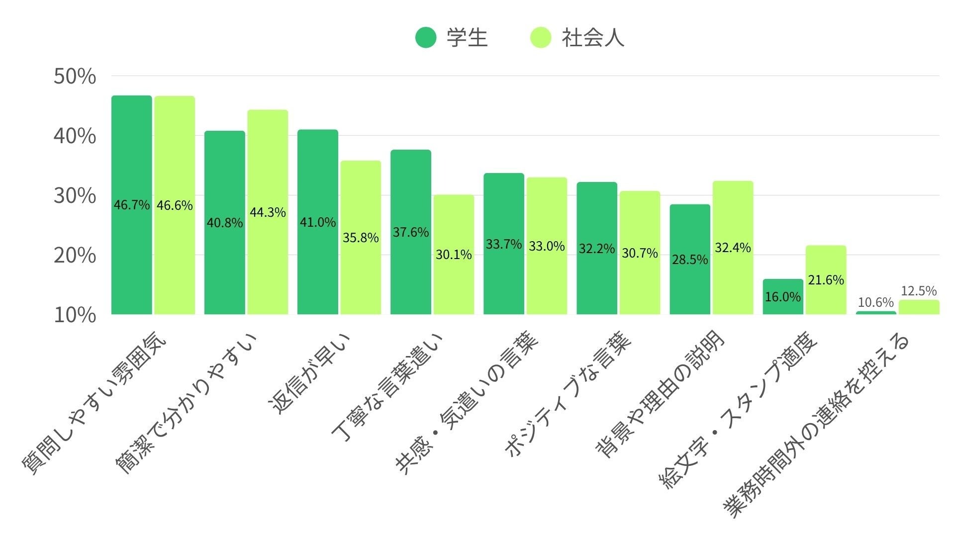 学生は「返信が早い」(41.0%)ことをより重視する一方、社会人は「簡潔で分かりやすい指示」(44.3%)や「理由や背景も説明してくれる」(32.4%)ことを求める傾向があり、立場によるニーズの違いが見られた。