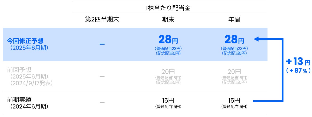 配当政策の変更に基づき、2025年6月期の配当予想を以下のとおり修正いたします。これは、当社株式の市場価格の動向、財務状況、今後の事業展開等を総合的に勘案した上で、株主の皆様への一層の利益還元を図るとともに、企業価値の向上を目的として実施するものであります。