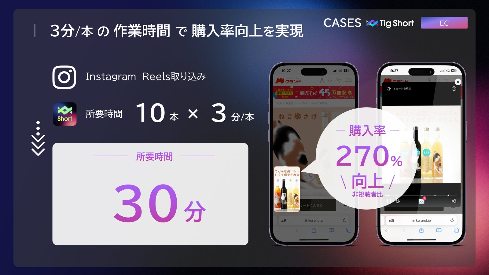 「Tig Short」では、これまでInstagramのリールで投稿していた動画コンテンツを取り込み、「Tig Short」としてタップひとつで購入につながるショート動画を制作。編集時間は1本あたりわずか3分と、スピーディな導入を実現しました。