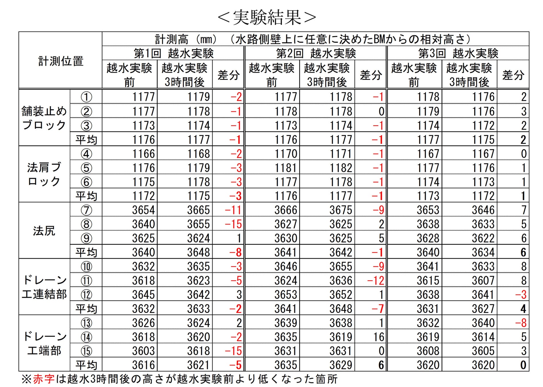 ・越流実験前と越水3時間後の各部位の平均計測高の変位差は8 mm以下と小さく、3回の越流実験全てでほとんど変位しておらず、堤防高さが維持されていました。