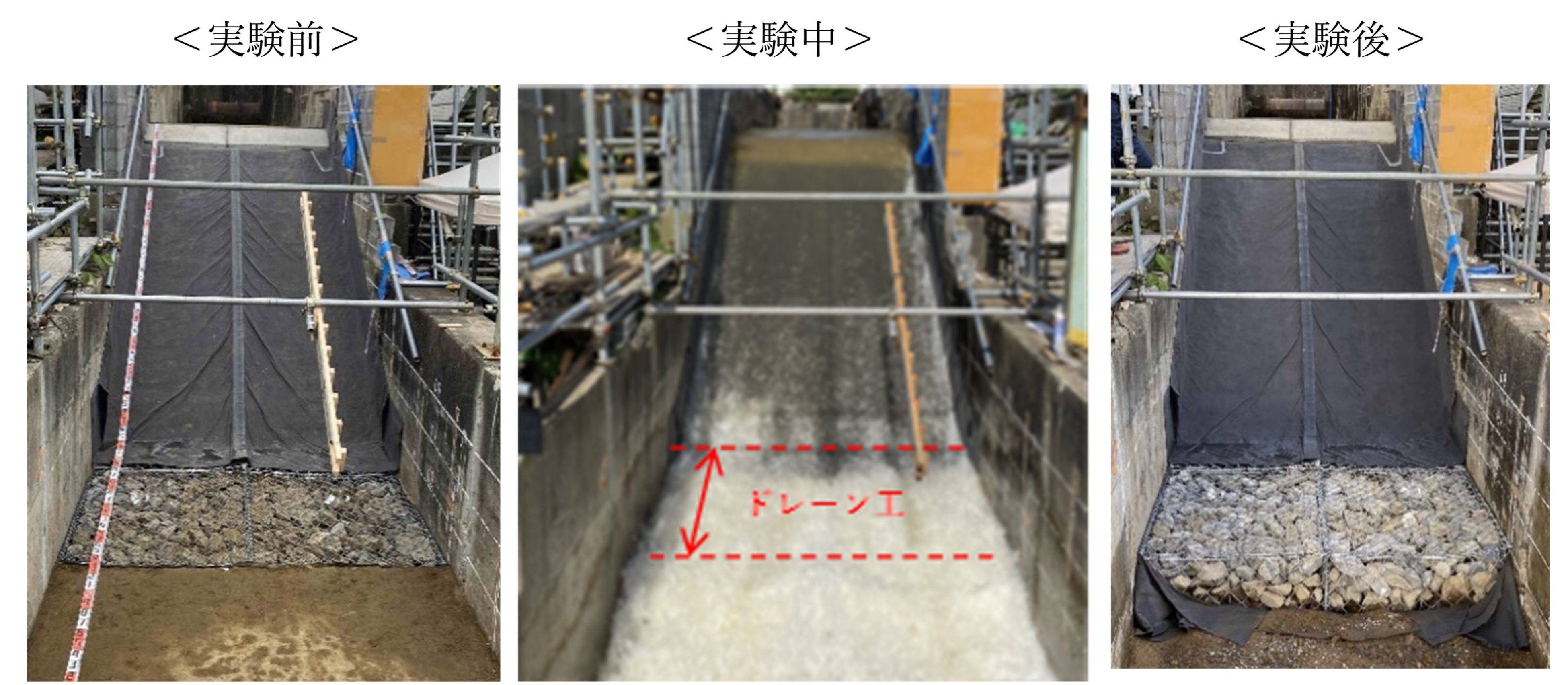 ・越流水深30cmまで一定速度で水位を上昇後一定に保ち、3時間以上の越流実験を実施。