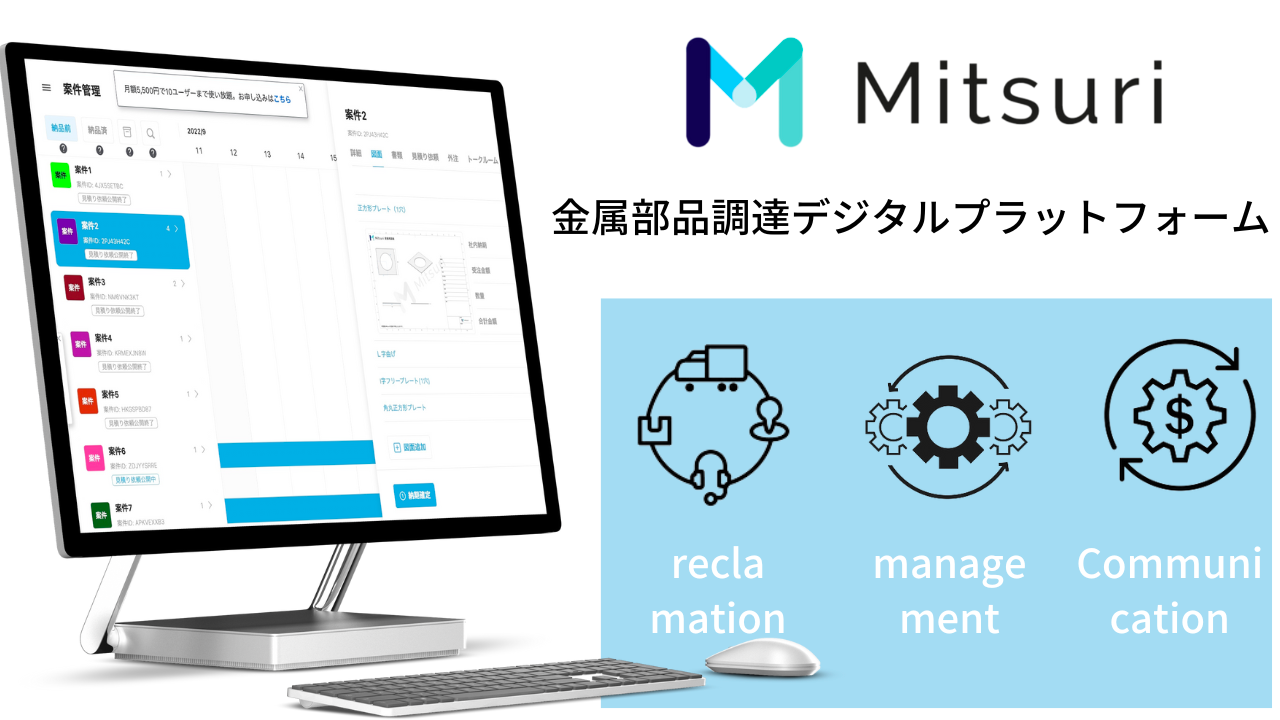 Mitsuriは金属加工品調達の発注企業とサプライヤー両方の業務をデジタルで支えるクラウドサービスです。業務プロセスごとに存在するアナログ業務を1ツールでDXできることが特徴で、新規取引先開拓から案件管理や工程スケジュール、それに関わる帳票自動生成を含めた事務作業までをクラウドで完結できます。コミュニケーションはチャットで行い、全ての業務ログはMitsuriに残るため過去の図面や案件情報の管理も簡単に実現します。主機能の1つであるマッチング機能は、中間マージン0円で直接取引が可能になっているため、業務効率化と併せて案件の始まりの営業から、ワンストップDX解決を実現しています。