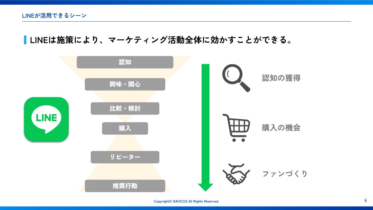 LINEは国内の月間アクティブユーザー数が9,700万人以上と言われており、幅広い年齢層に活用されています。主に個人のコミュニケーションツールとして活用されているLINEですが、施策によって認知の獲得から購入機会の創出、ファンづくりまで様々なマーケティングのフェーズに活用することができます。