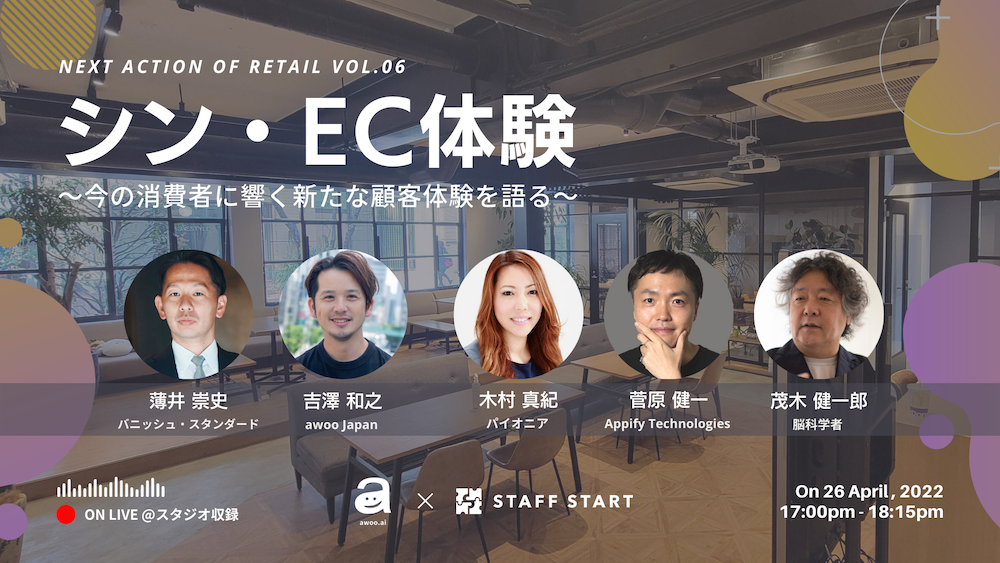 グローバルAIテックカンパニーのawoo Japan株式会社(本社:東京都新宿区、代表:林思吾、以下、awoo Japan)は、スタッフDXのアプリケーションサービス「STAFF START(スタッフスタート)」を運営する“Staff Tech(スタッフテック)”カンパニー、株式会社バニッシュ・スタンダードと共催で「NEXT ACTION of Retail vol.06 シン・EC体験 〜今の消費者に響く新たな顧客体験を語る〜」を4月26日に開催いたします。トークゲストには、パイオニアの木村真紀氏、Appify Technologiesの菅原健一氏、脳科学者の茂木健一郎氏らが登壇します。