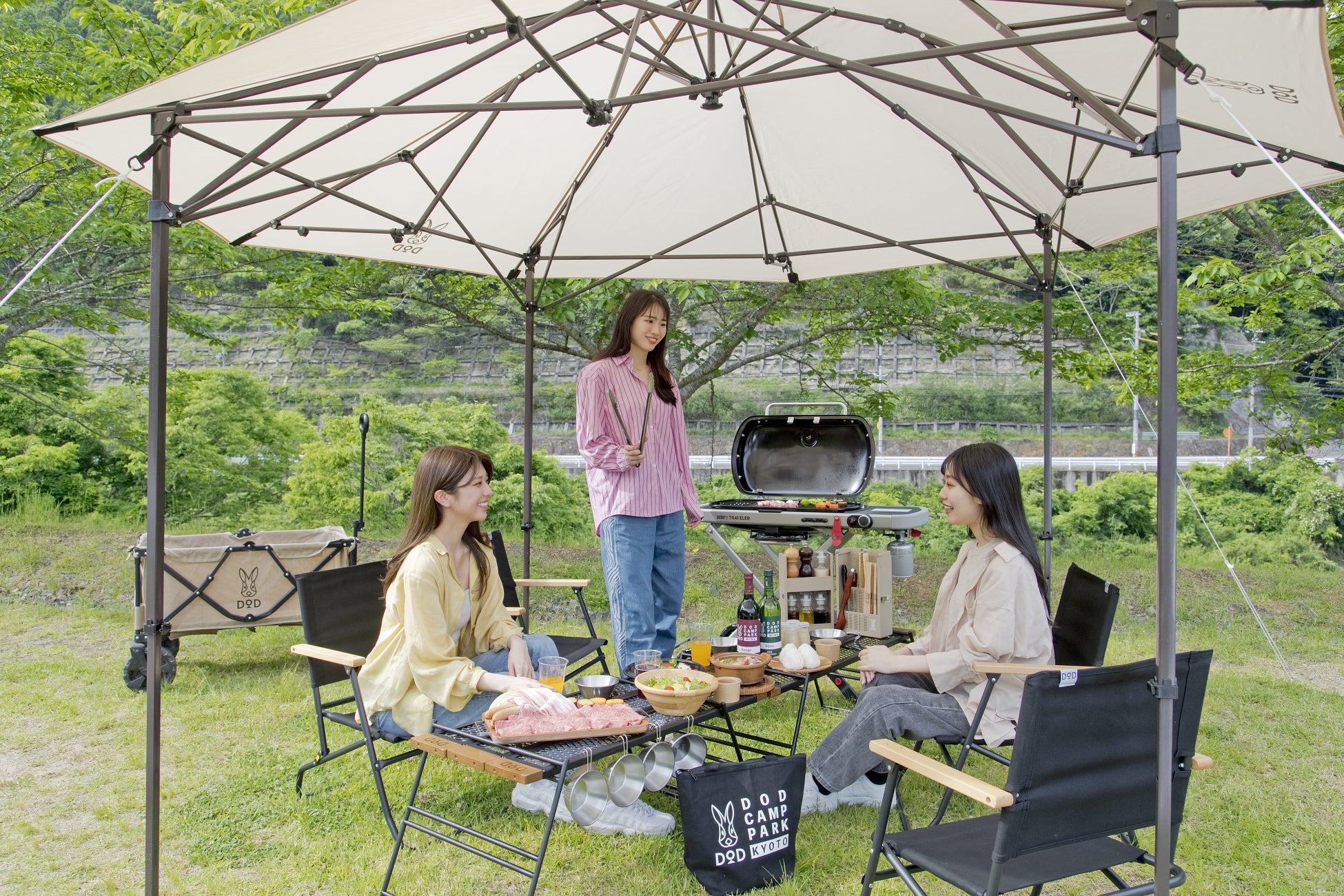 京都府・南丹市の日吉ダム下流にある「道の駅 スプリングスひよし」内にオープンする日本初!DODの日帰りBBQエリア「DOD RIVERSIDE BBQ」は、実店舗を持たない、大阪発の人気キャンプブランドDODのギアを実際に手に取り、試せる、数少ないBBQ場です。タープやテーブル、チェアのほかに、調理アイテムもご用意しており、可愛い見た目と使いやすさを実際にご体感いただけます。また、BBQグリルは、今年日本に上陸した米国BBQグリルブランドWeber Inc. の最新ガスグリルを設置しております。グリルの特長であるフタをすることで、食材本来の水分を閉じ込め、多彩なお料理をジューシーで美味しく仕上げます。