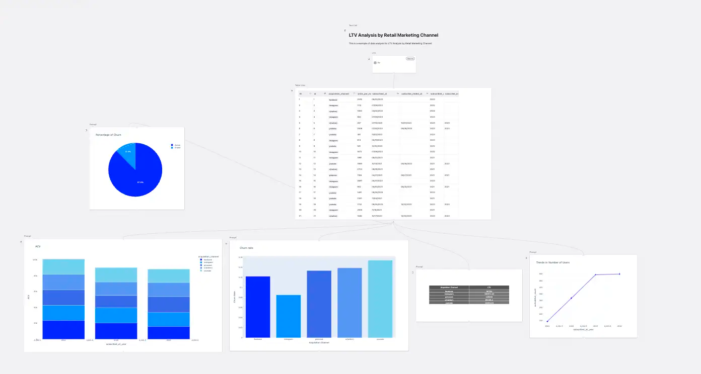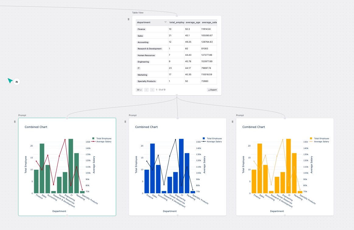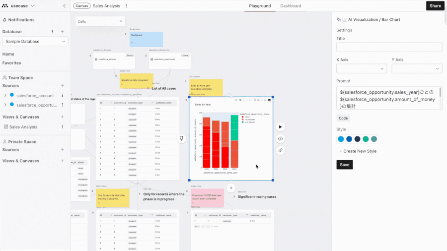 ホワイトボード形式の直感的なUIからプロンプトを用いて誰でも簡単にデータ分析を行うことが可能です。そのため、データ分析に慣れていないメンバーでも分析業務に取り組むことができます。