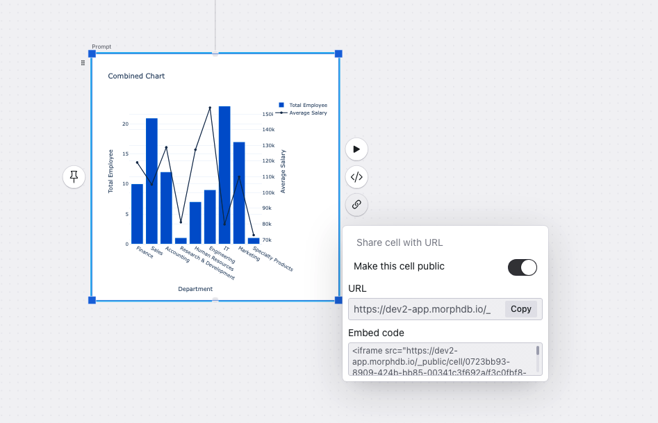 これまでも、ダッシュボード上に配置したうえで、ダッシュボード全体を共有・埋め込みすることは可能でしたが、本アップデートによりチャートの活用の幅が広がりました。またiframeコードを目視しながらコピーすることもできます。