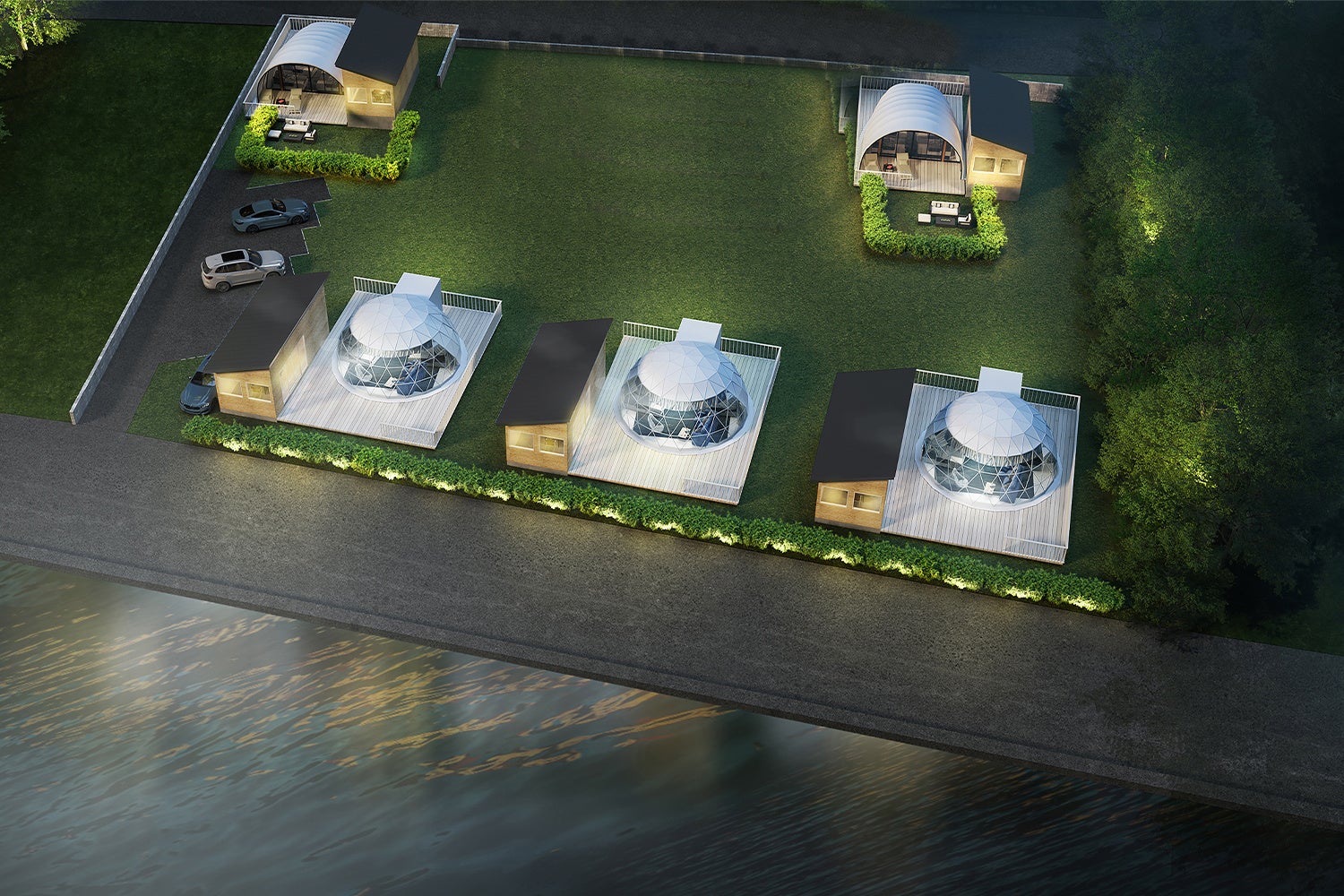 2021年8月オープンのグランピング施設。海の向こうには瀬戸内の島々も眺められる絶好のロケーションに位置する全7棟のドーム型テントは、2ベッドタイプ、4ベッドタイプ、ラグジュアリー4ベッドタイプの3タイプをご用意しております。