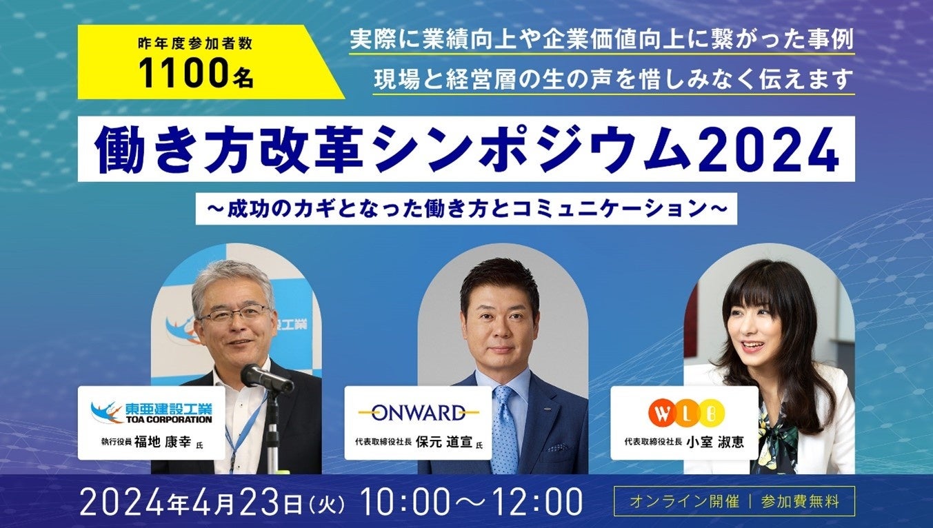 2006年の創業以来3,000社の働き方改革を支援する株式会社ワーク・ライフバランス(所在地:東京都港区、代表取締役社長:小室淑恵、以下「当社」)が2024年4月23日(火)10時~12時に開催する「働き方改革シンポジウム2024~成功のカギとなった働き方とコミュニケーション~」(以下「本シンポジウム」)の参加申込者数が、このほど1,000名を突破したことをご報告いたします。